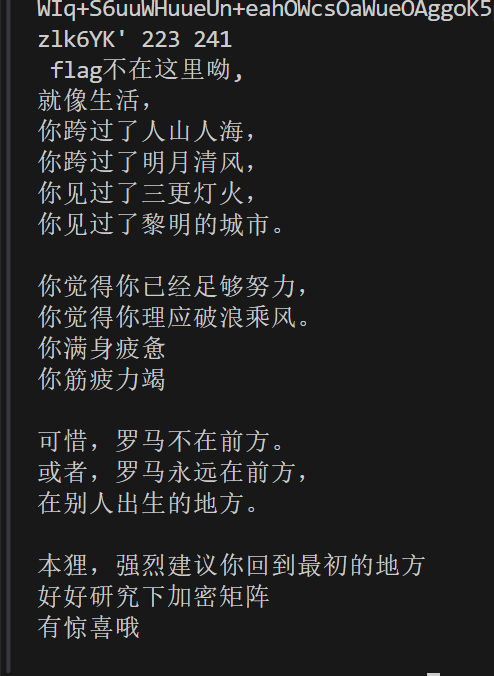 pythonfrom Crypto.Cipher import ARC4 # 密钥 key = b"Flag{This_a_Flag}" key_len = len(key) # 密文(16进制转二进制) cipher_hex = 'E8D8BD91871A010E560F53F4889682F961420AF2AB08FED7ACFD5E00' cipher_bin = bytes.fromhex(cipher_hex) # RC4解密 rc4 = ARC4.new(key) decrypted = rc4.decrypt(cipher_bin) # 逆向异或(得到Base64解码前的原始数据) xor_reversed = [] for i in range(len(decrypted)): xor_byte = decrypted[i] ^ key[i % key_len] xor_reversed.append(xor_byte) print("原始字符串:", bytes(xor_reversed).decode('utf-8'))