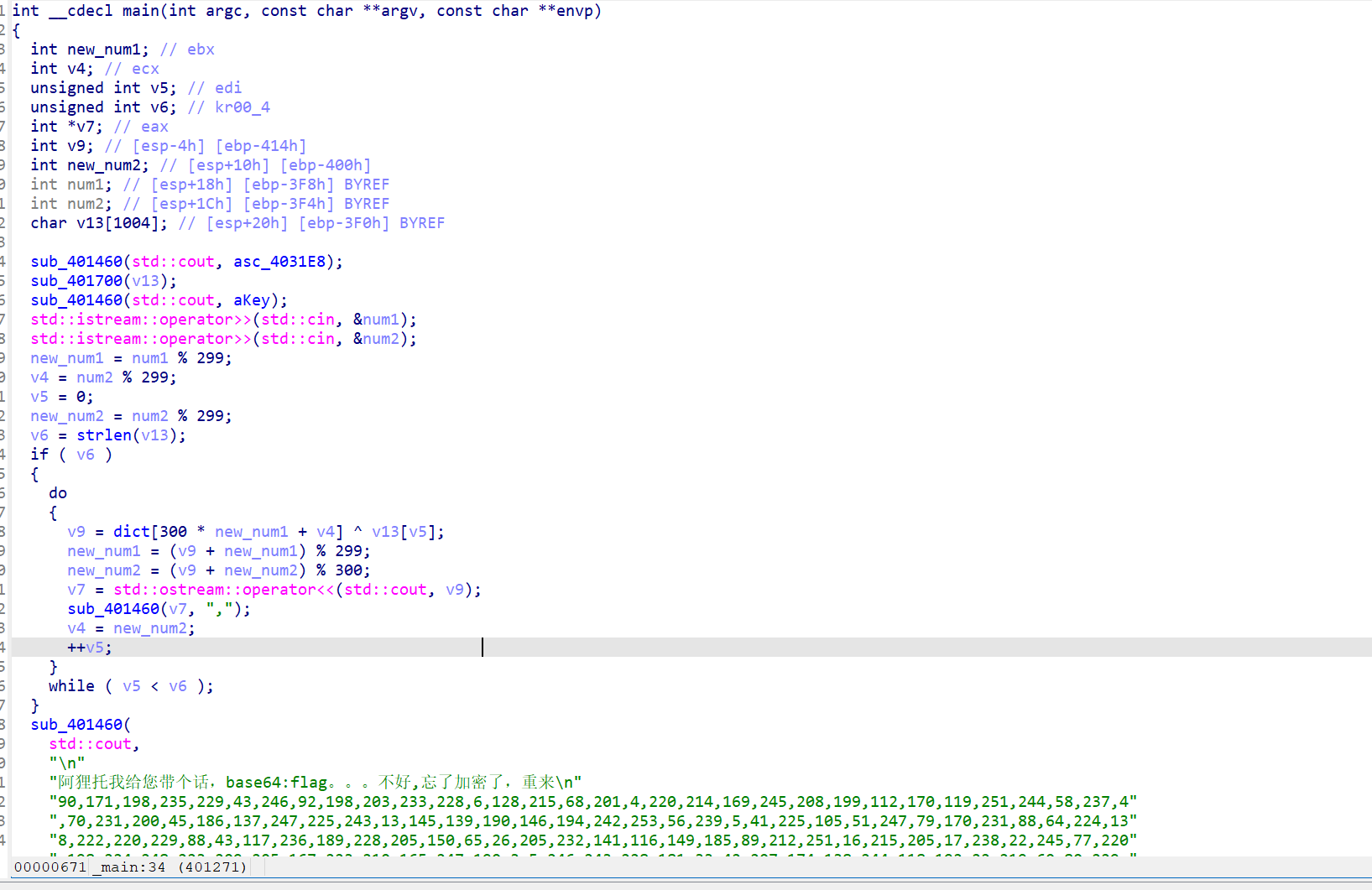IDA代码如上,应该是只有C能让里面有的大数异或后输出字符。但是编码始终出不来中文,注意到必须用gb2312编码