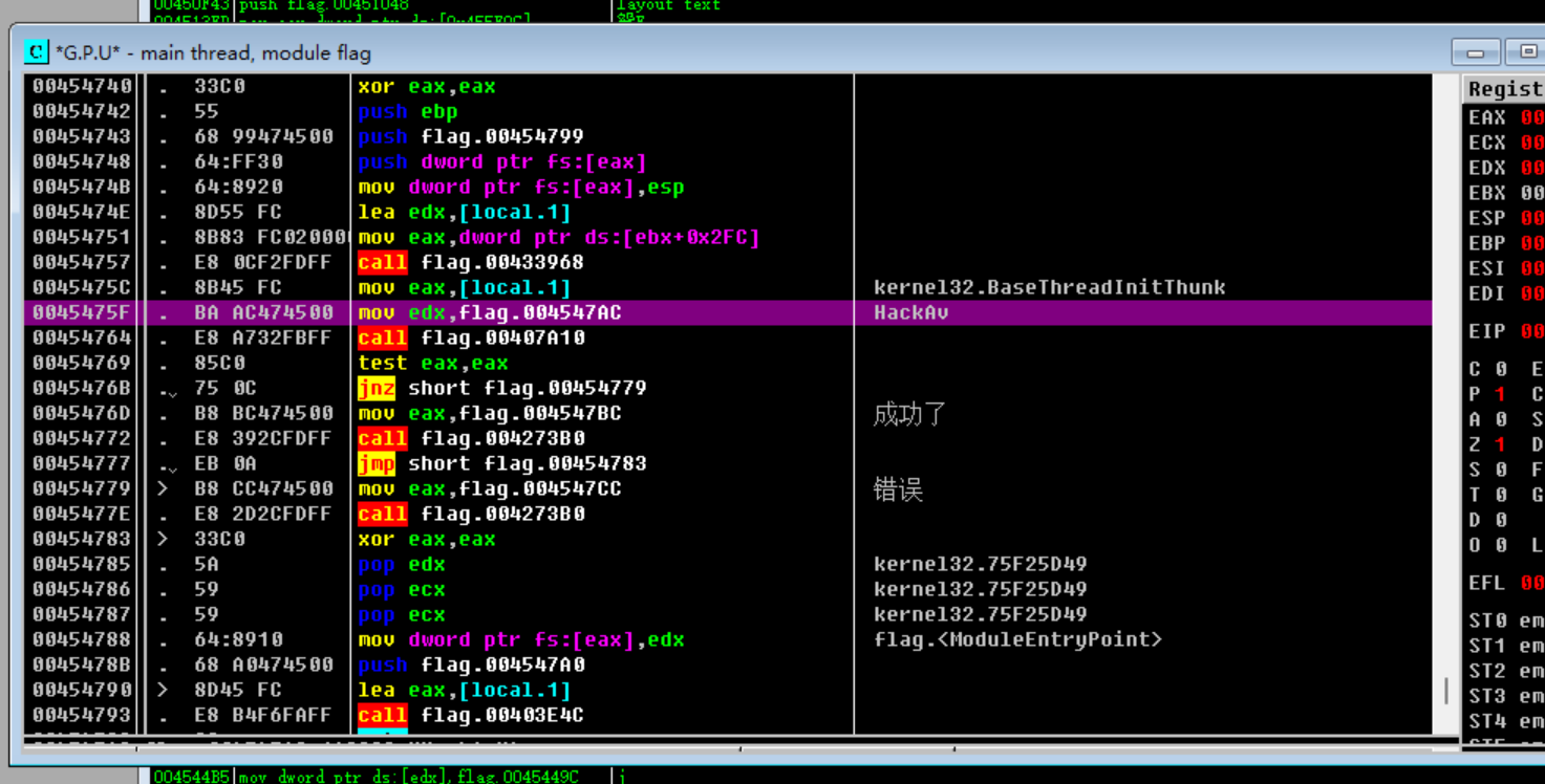 利用OD查看字符串,随后锁定到成功了,观察附近汇编显然发现HackAv就是flag。