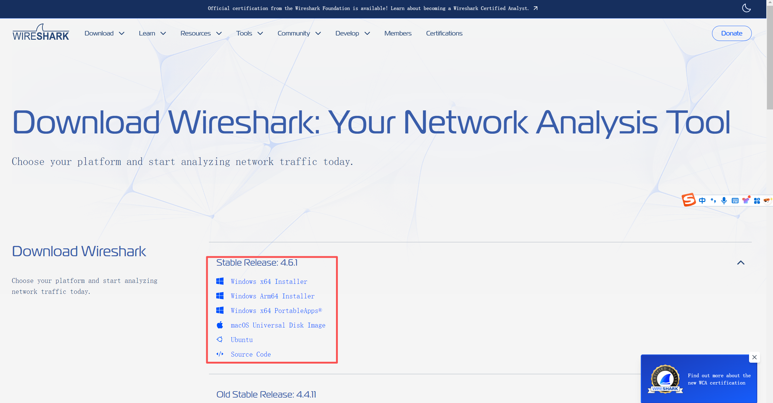 进入wireshark'官方网址https://www.wireshark.org/download.html