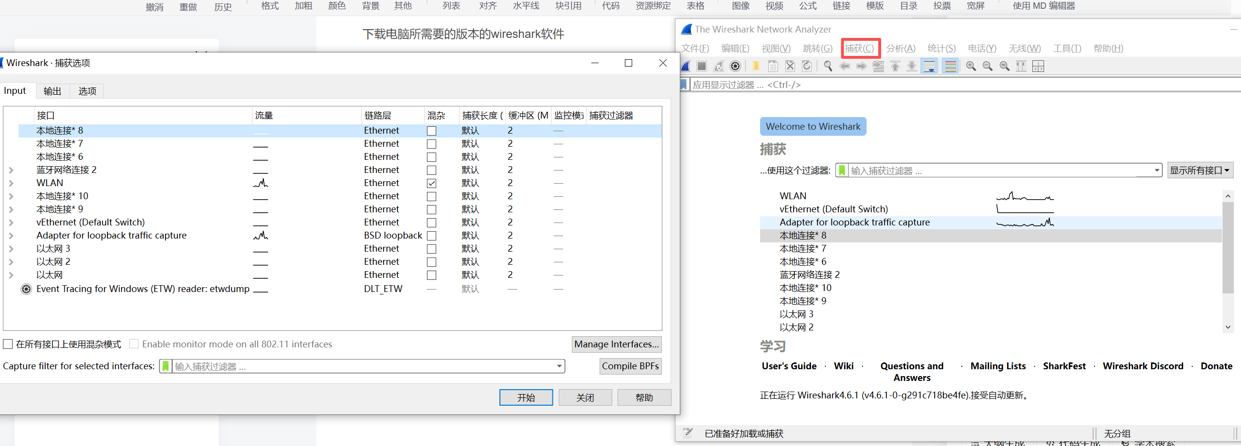 点击捕获,选项,在对应的无线连接 选择混杂模式,双击之后进入捕捉