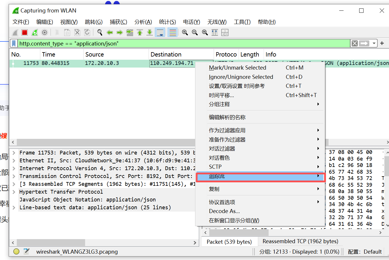 在响应的链接下面选择追踪流、http流,查看对应的发送的报文和响应的回复