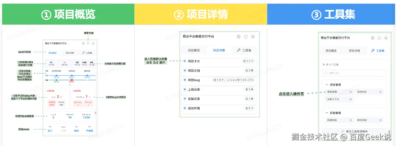 通过具象化的配置实践,可在实际业务场景中落地,助力各角色高效协作,破解产研团队项目管理痛点 。以下实践案例,包括:项目概览 、项目详情 、工具集三大类内容,且支持PC和手机端样式,以及群吊顶和侧边栏位置。