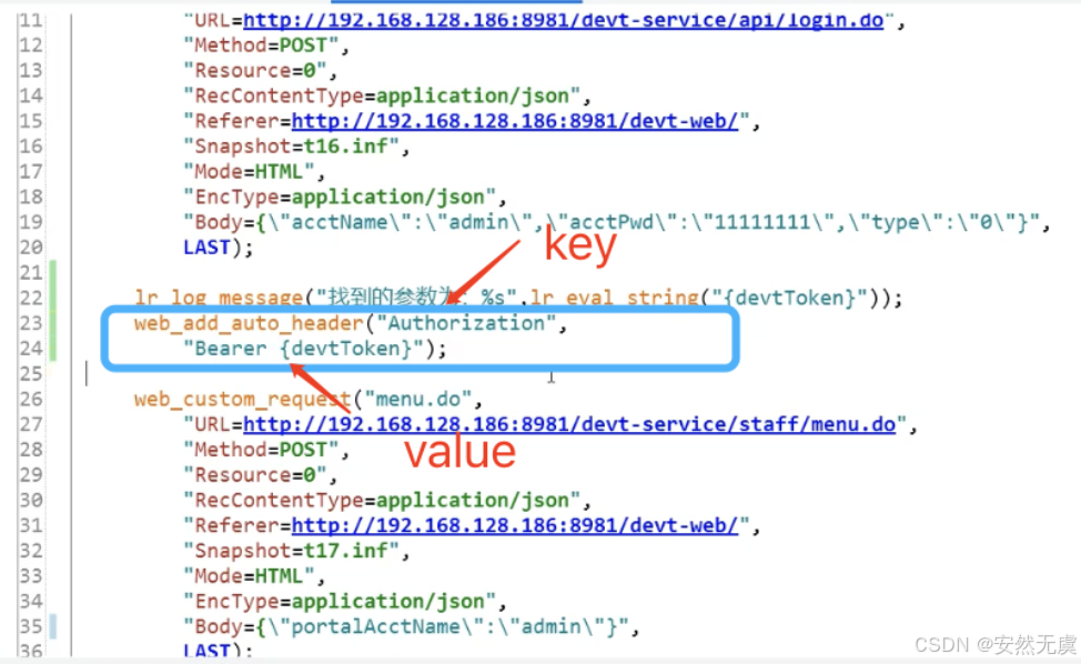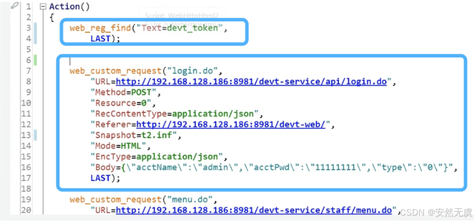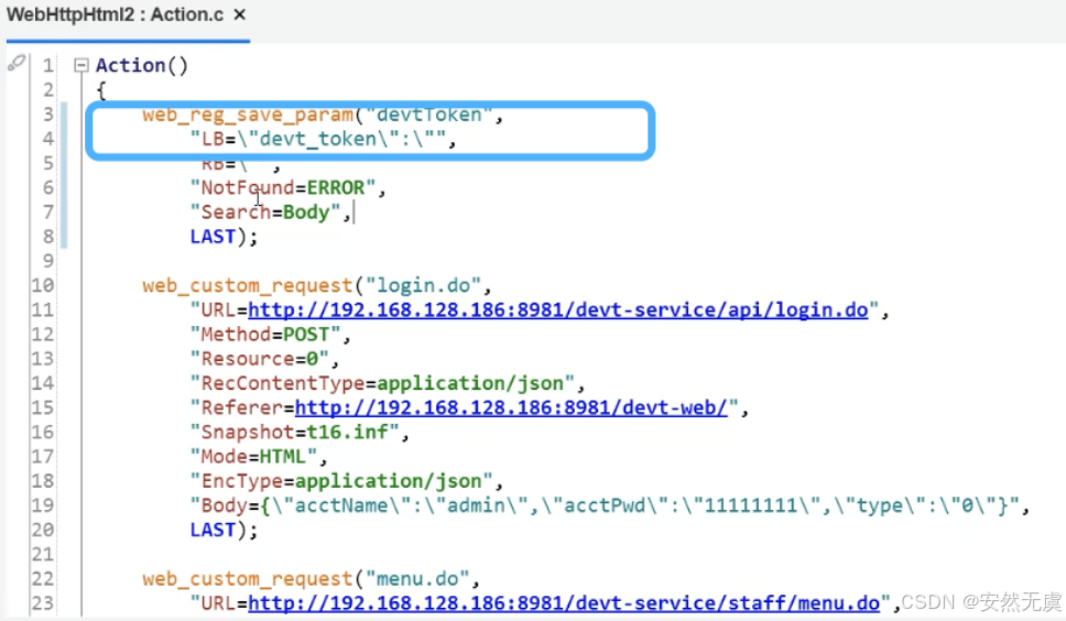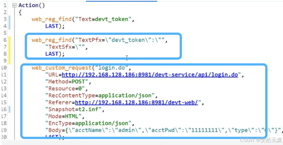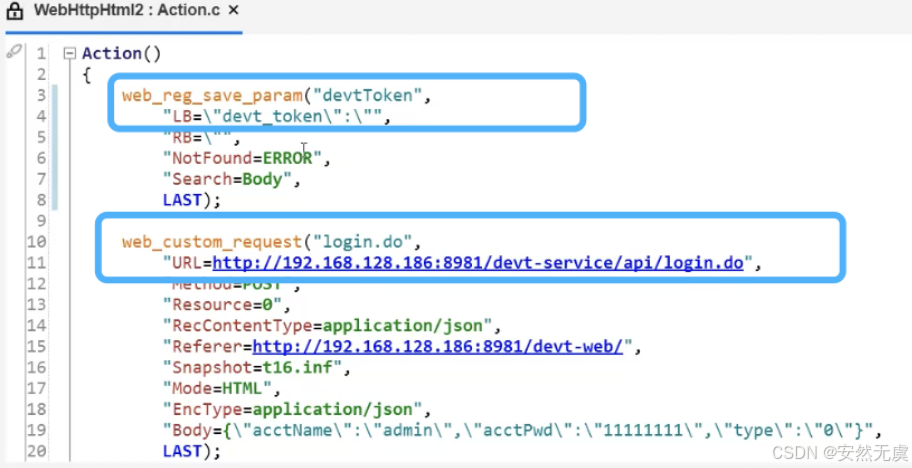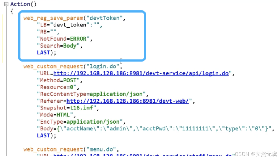 - 这个 web_reg_save_param() 函数需要放到 前置请求的前面一个, 比如这里要获取登陆请求的返回值, 那么这个函数就需要放到登陆接口的前面一个, 这样这个函数才能作用于登陆接口, 与后面的请求无关.