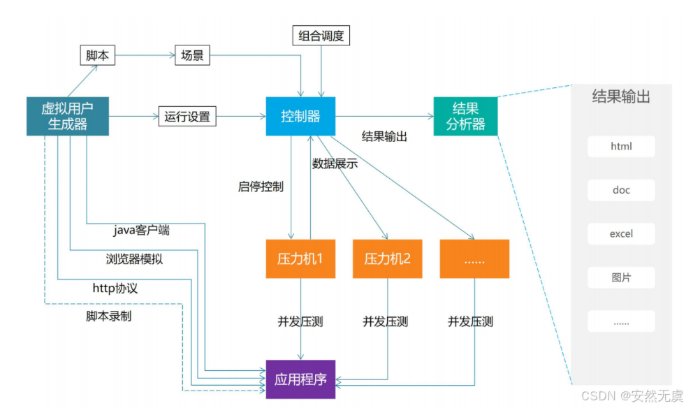按计划, 按目标来控制用户数量, 通过脚本组合设计负载场景和方案.