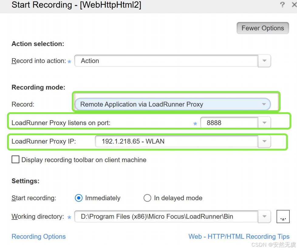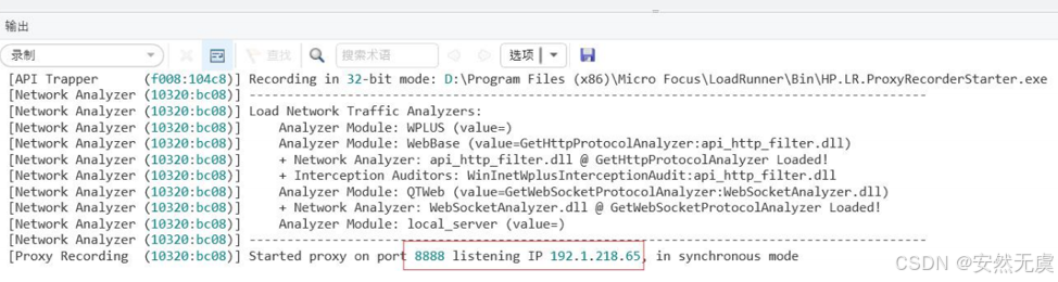录制方式选择 远程应用LoadRunner代理 模式, 选择监听端口和代理IP: