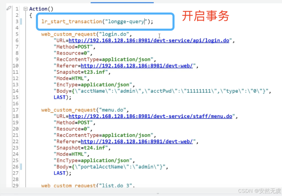 - 开启事务: lr_start_transaction()