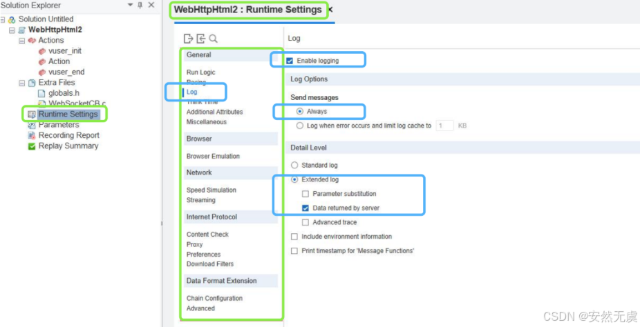 和前面一样, 首先在 虚拟用户生成器 中新建一个 解决方案和脚本, 接下来开始进行录制配置: