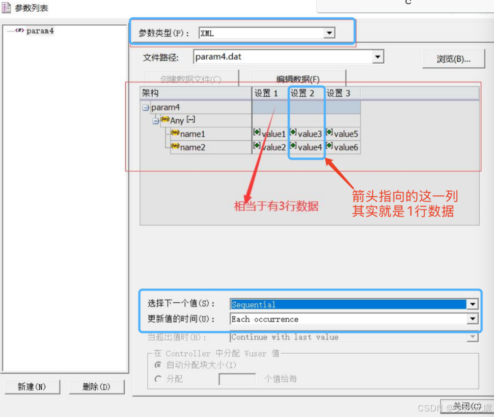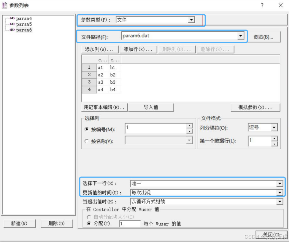 以表格中的行数据为基础生成的参数, 支持记事本编辑以及从CSV等文件中导入, 每一行各列之间的数据可以设置分隔符.