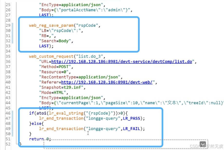 如果我们要判断请求是否正常, 需要对其返回值做校验, 比如这里我们调用 web_reg_save_param()函数, 获取 rspCode值, 如果其大于0则正确, 否则请求错误.