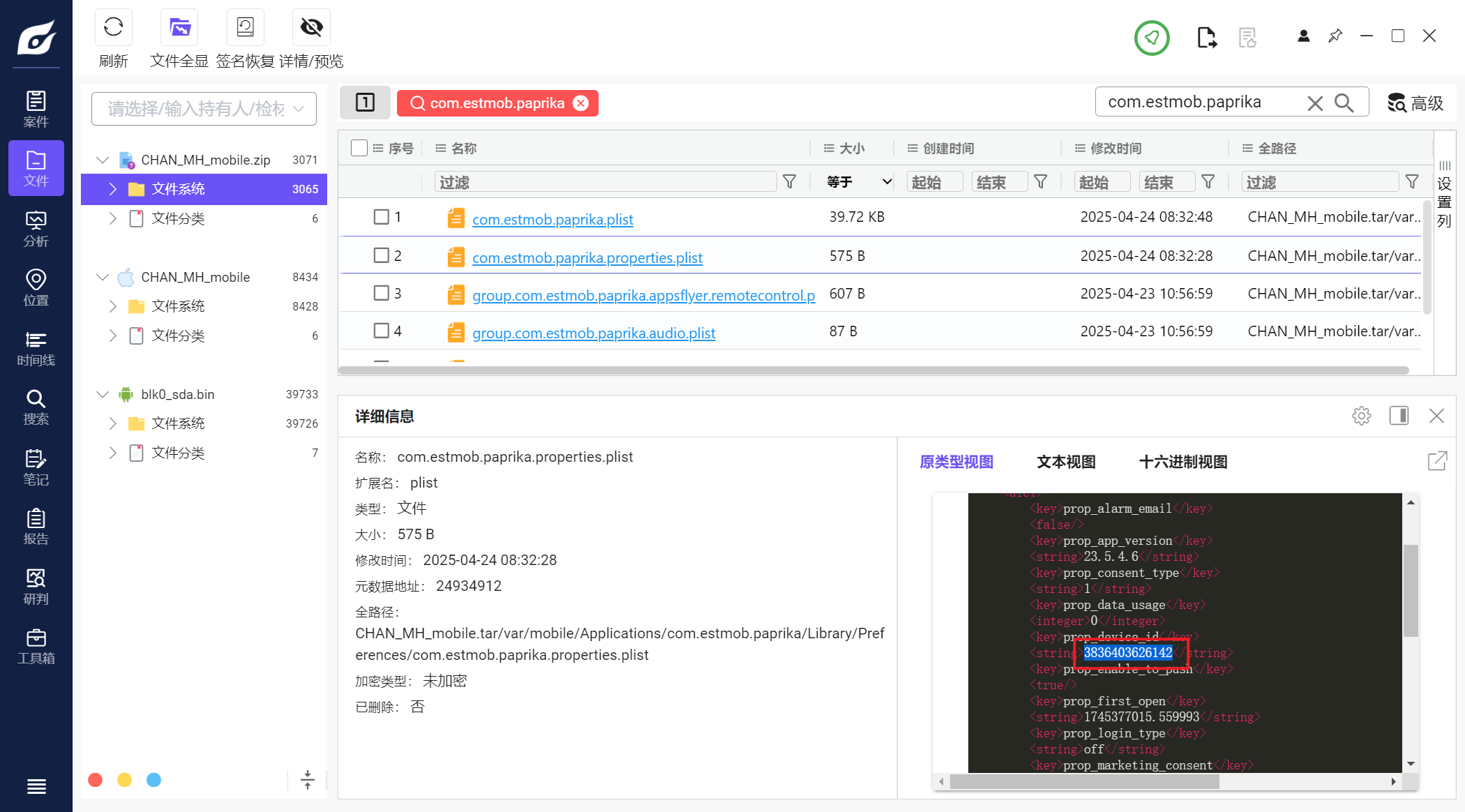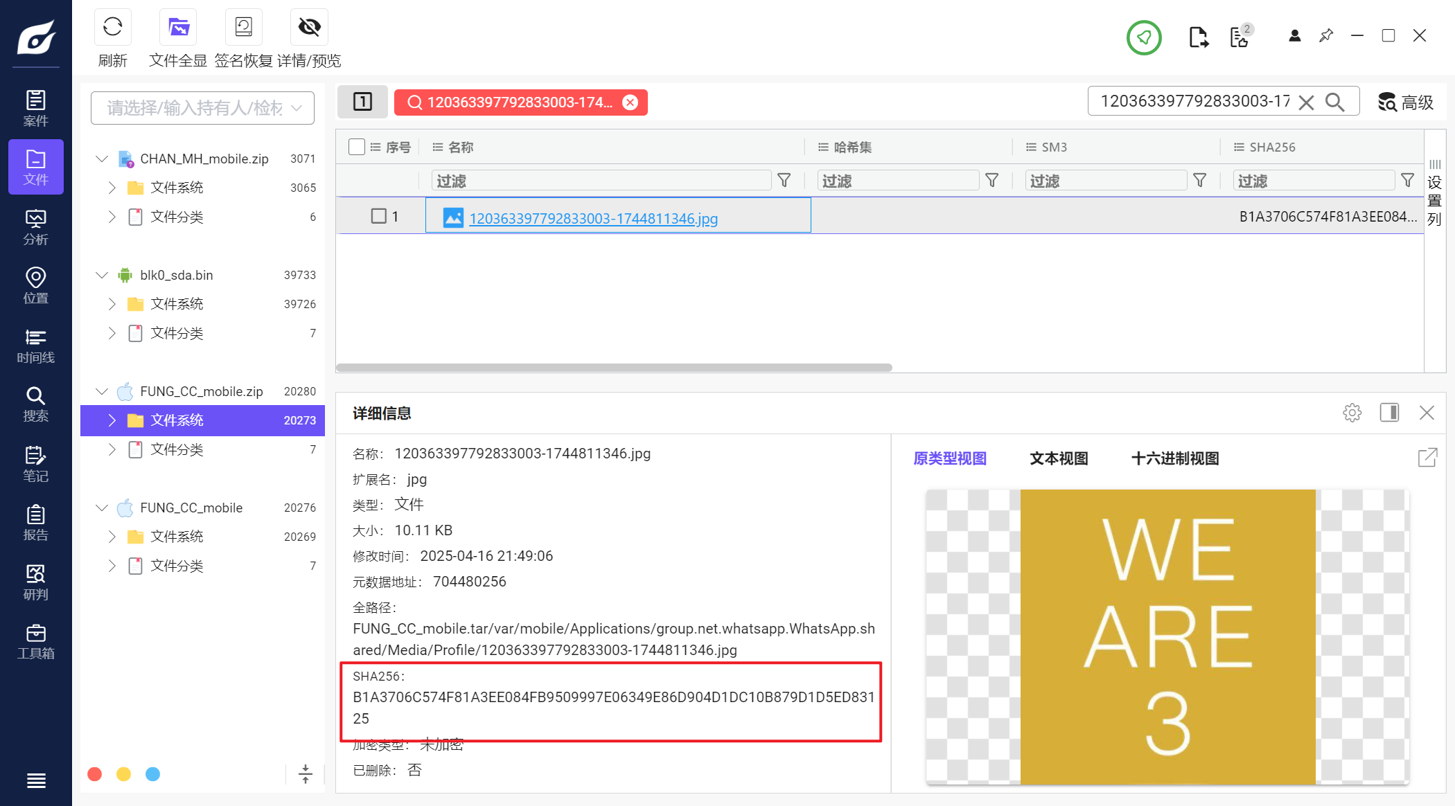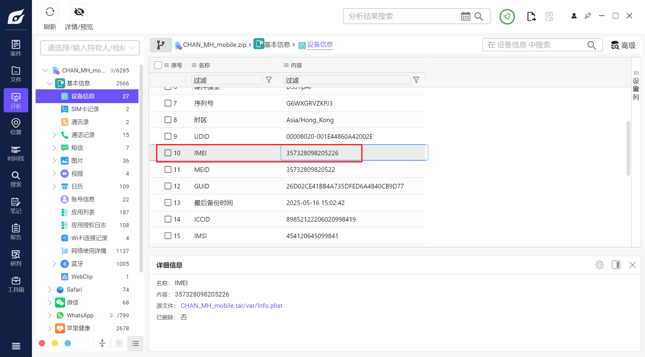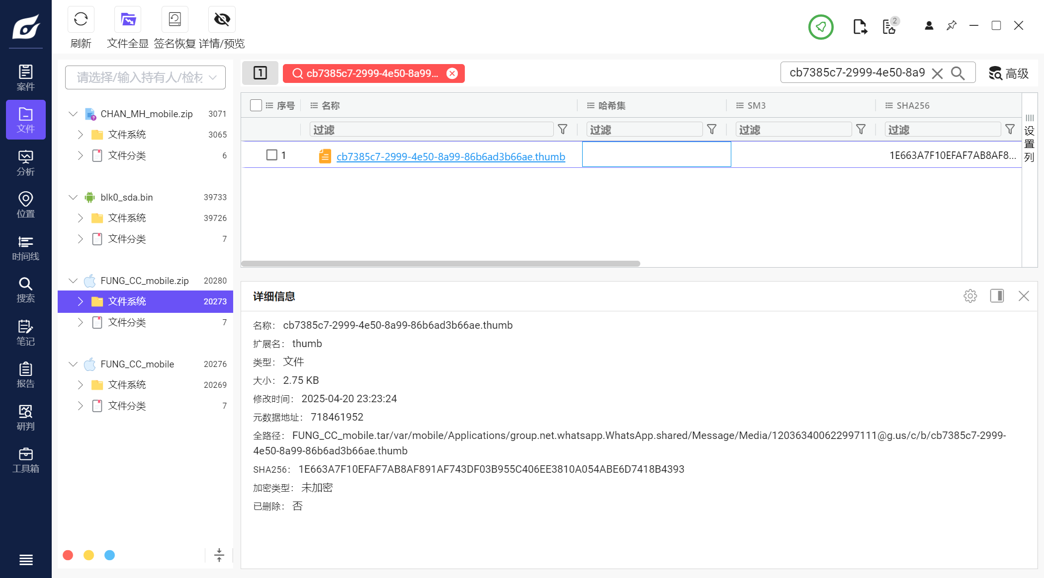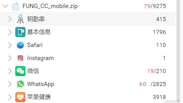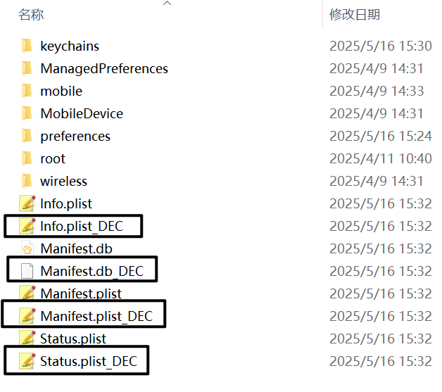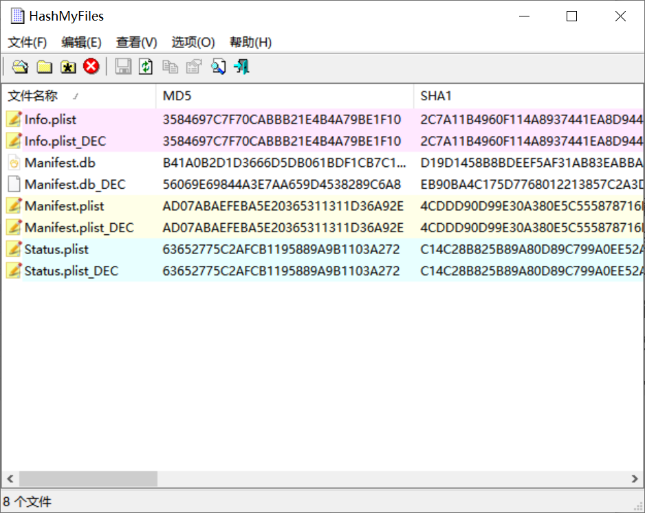 这里文件名有一些包含_DEC的文件,这些是提取工具解密后生成的文件,如果将info.plist和info.plist_DEC分位一组,经我计算哈希发现,除了Manifest.db这一组,其余组的哈希都是一样的