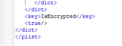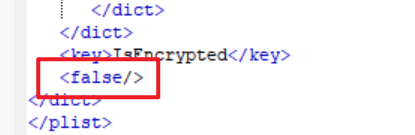 仅此是不够的,在Manifest.plist的最后有一个字段,IsEncrypted,像这种plist文件用vscode、记事本什么的打开是无法看到有效数据的,我们可以用plistEditor工具打开并对其修改数据