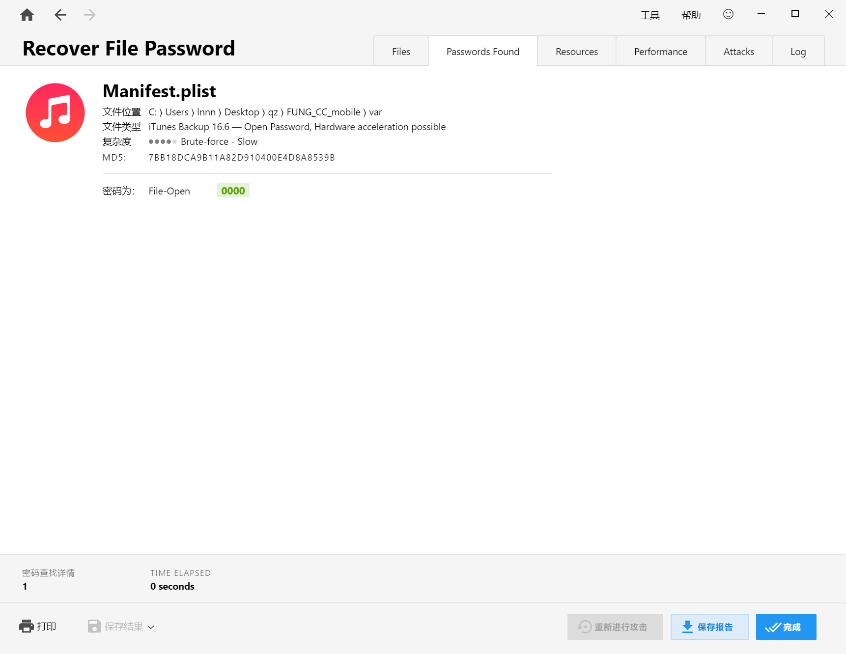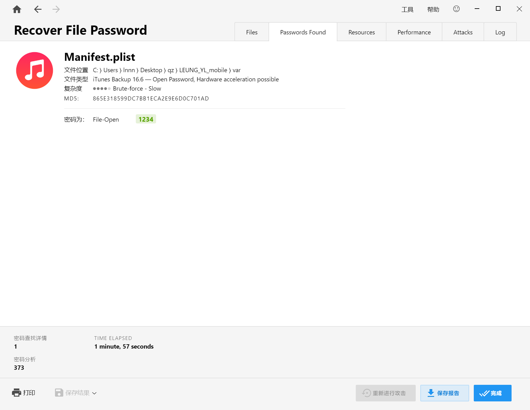 常规方法是将Manifest.plist拖入Passware kit爆破得到备份密码,但是也仅用于简单一点的密码,一旦上了6位甚至更高,机器烧坏可能都爆不出来