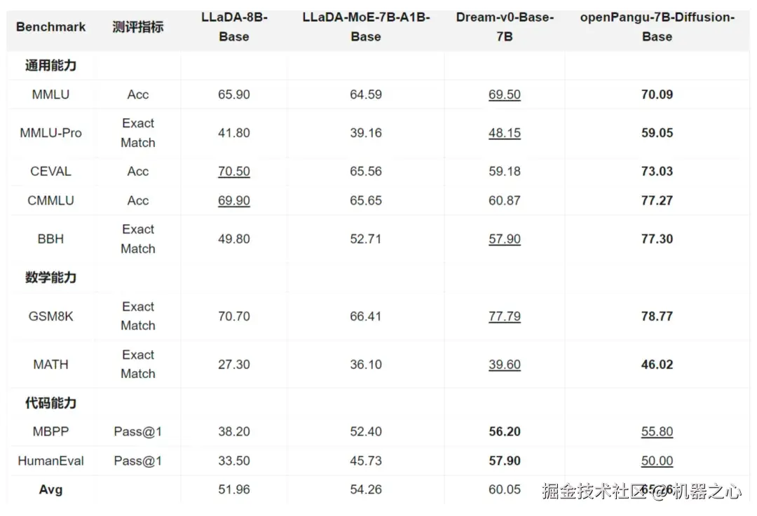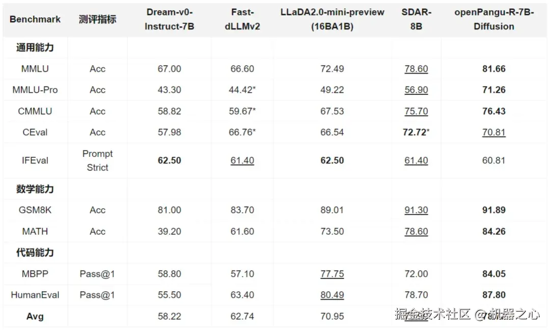 值得一提的是,openPangu-R-7B-Diffusion 的训练、推理及评测全流程均在昇腾 NPU 集群上完成,有力证明了国产算力在以前沿扩散语言模型领域的强劲实力。