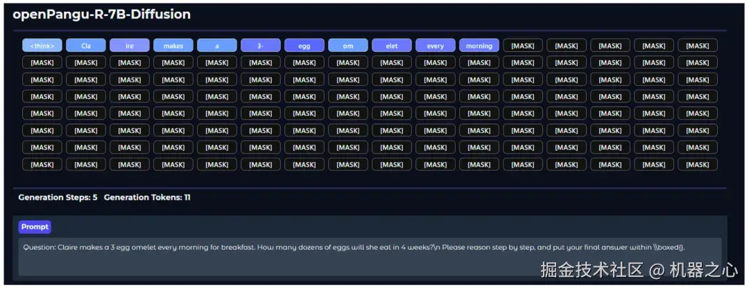 在输入一道经典的数学逻辑推理题(Claire 的煎蛋问题)后,我们可以清晰地观察到扩散语言模型的独特生成方式:模型并非像传统自回归模型那样「逐词蹦出」,而是在 4 个生成步数(Generation Steps)内,并行地将多个 [MASK] 噪声逐步去噪还原为 、Claire、makes 等清晰的语义 Token。