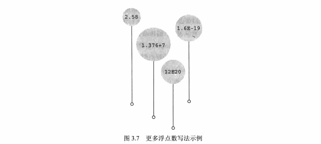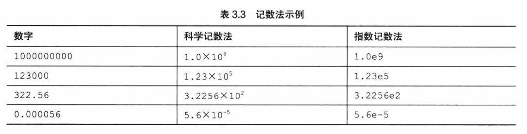 第1列是一般记数法;第2列是科学记数法;第3列是指数记数法(或称为e记数法),这是科学记数 法在计算机中的写法,后面的数字代表10的指数。图3.7 演示了更多的浮点数写法。