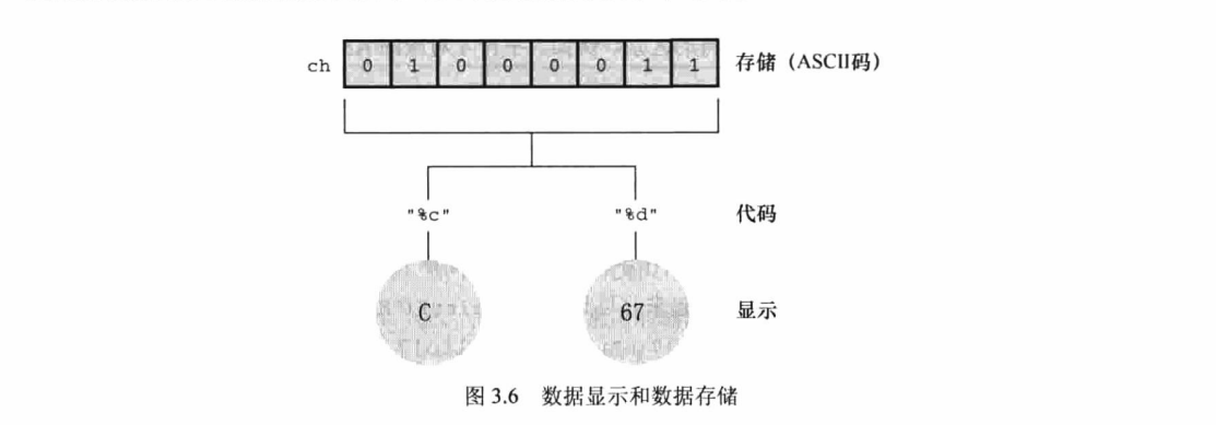 运行该程序时,在输入字母后不要忘记按下 Enter 或 Return 键。随后,scanf()函数会读取用户输 入的字符,符号表示把输入的字符赋给变量 ch。接着,printf()函数打印 ch 的值两次,第1次打印一 个字符(对应代码中的%c),第2次打印一个十进制整数值(对应代码中的d)。注意,printf()函数中 的转换说明决定了数据的显示方式,而不是数据的储存方式(见图 3.6)。