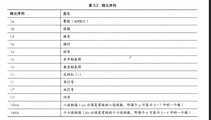 表3.2 中的最后两个转义序列(\0oo 和\xhh) 是 ASCII 码的特殊表示。如果要用八进制 ASCII 码表 示一个字符,可以在编码值前面加一个反斜杠()并用单引号括起来。例如,如果编译器不识别警报字符 (\a),可以使用 ASCII 码来代替:
