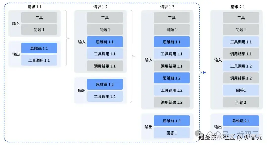 在 V3.2-Exp 时期(以及其他大多数推理模型),模型像是一个记性不好的老学究:它会先花很长时间思考,决定调用一个工具(比如搜索天气)。