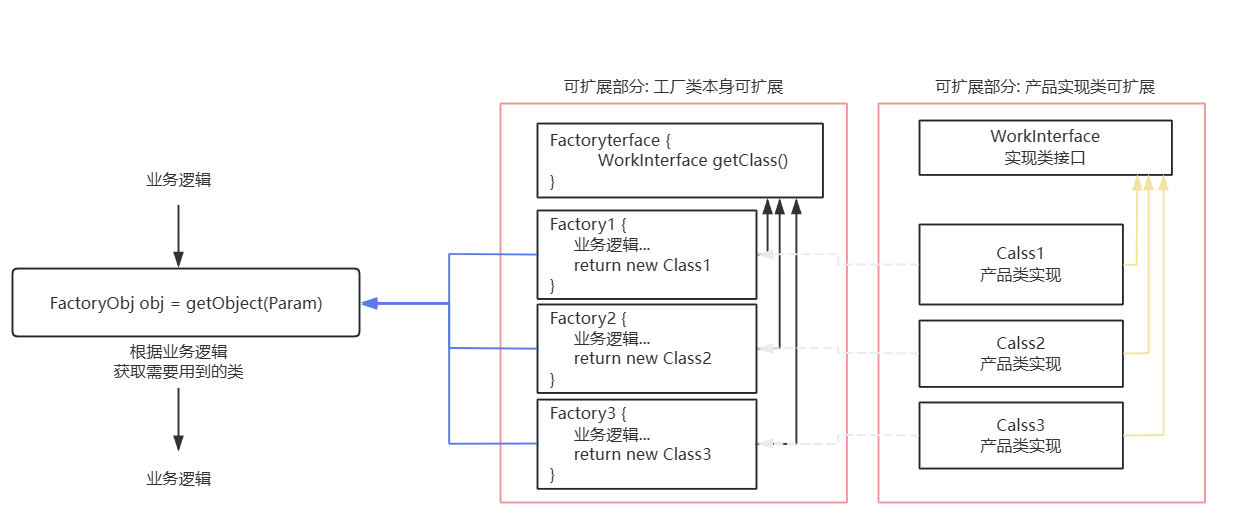 工厂方法模式是为了将核心业务逻辑与具体实现类解耦, 从工厂类中实现一定程度的扩展
