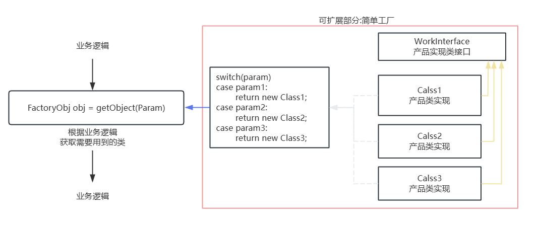 简单工厂主要解决的问题就是使用端不再通过大量的if-else去创建结构相似的类, 而是把这种创建类的操作封装在工厂类中, 使用端通过不同的参数就可以得到对应的类实例.