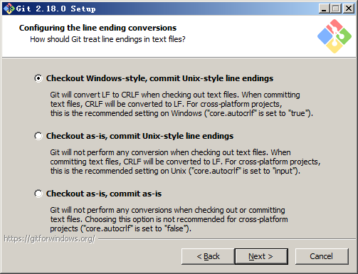 | Checkout Windows-style, commit Unix-style line endings(当前选中) | 检出文件时将 LF 转为 CRLF(适配 Windows 编辑器),提交时将 CRLF 转为 LF(统一仓库格式) | 大多数用户:本地用 Windows 开发,需与跨平台项目(如 GitHub 开源项目)协作 |