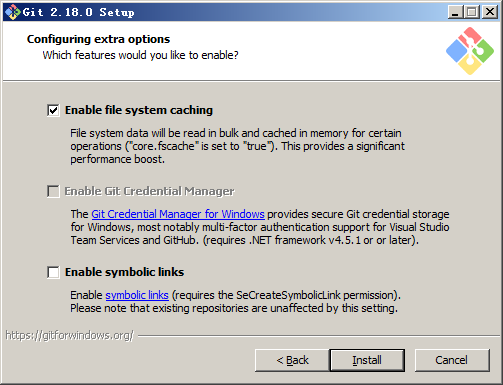 | Enable Git Credential Manager | 提供安全的凭据存储功能,支持 GitHub、Visual Studio Team Services 等平台的多因素认证,避免重复输入账号密码 | 建议勾选:日常使用 Git(尤其是连接远程仓库)的必备功能,需依赖.NET Framework 4.5.1+ |