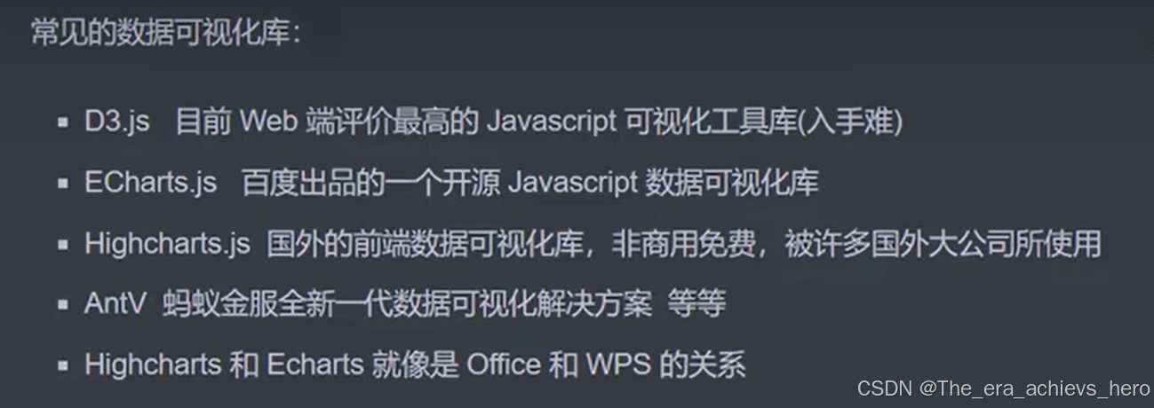 Echarts--一个使用js实现的开源可视化库,可以流畅的运行在PC和移动设备上,兼容当前绝大部分浏览器,底层依赖矢量图形库ZRender,提供直观,交互丰富,可高度个性化定制的数据可视化图标。