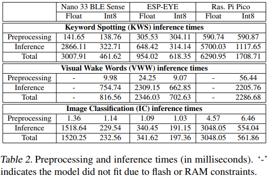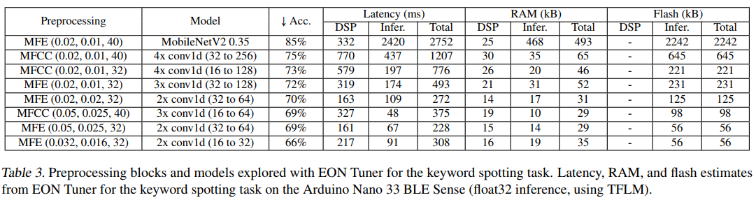 表2展示了三种硬件平台的详细延迟分解。以关键词检测为例,在Nano 33 BLE Sense上: