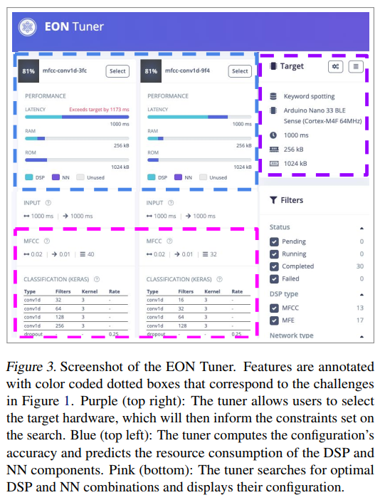 图3展示了EON Tuner运行后的结果界面。顶部的紫色区域显示了目标硬件选择(如Arduino Nano 33 BLE Sense),这将决定搜索的约束条件。左侧的蓝色区域展示了各种配置的准确率以及DSP和神经网络组件的资源消耗预测。主界面显示了多个配置选项,每个选项都有详细的性能指标条形图,包括延迟(Latency)、RAM使用和Flash使用。底部的粉色区域详细列出了每个配置的DSP和NN组合参数,如MFCC设置、卷积层数量等。右侧的过滤器允许用户根据性能要求筛选配置。