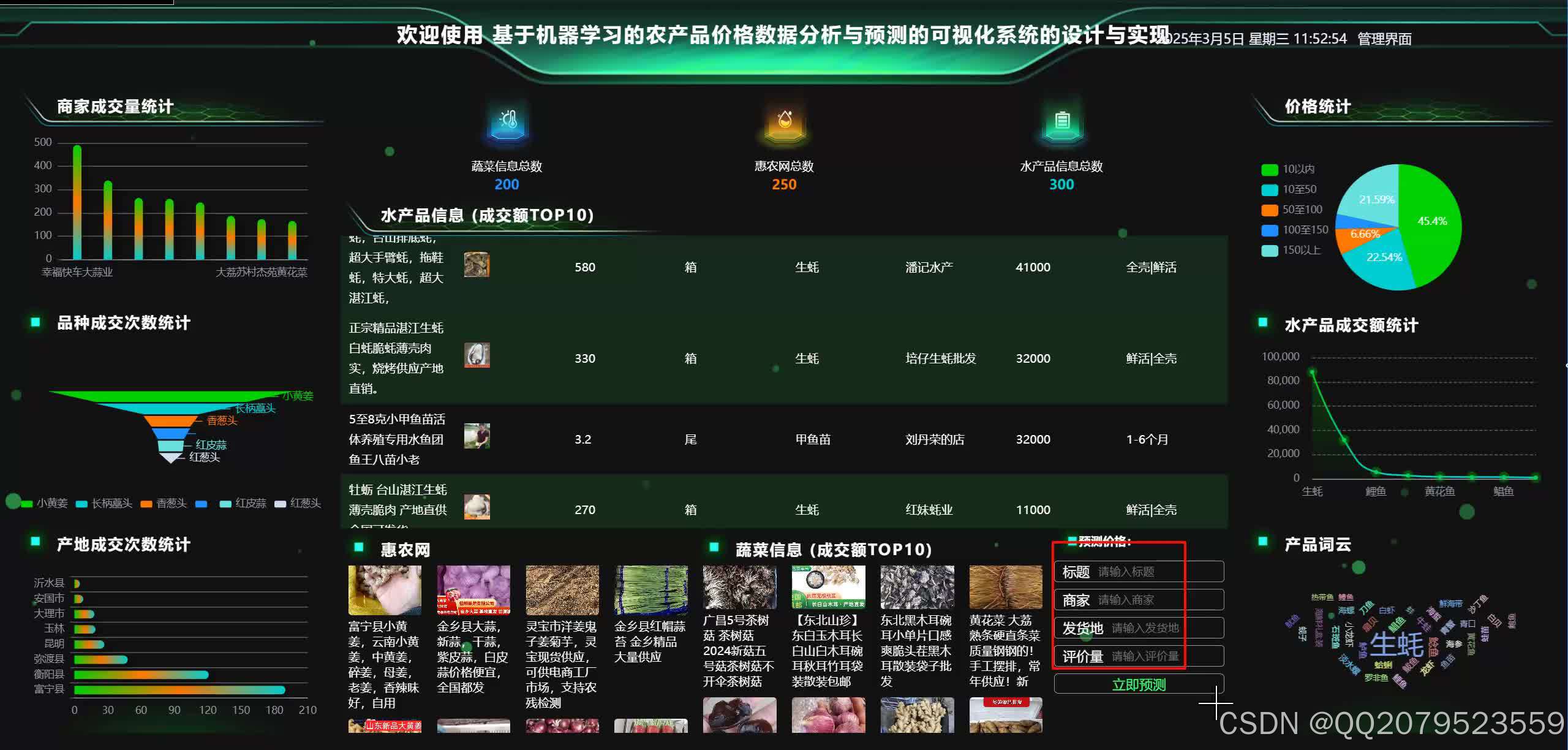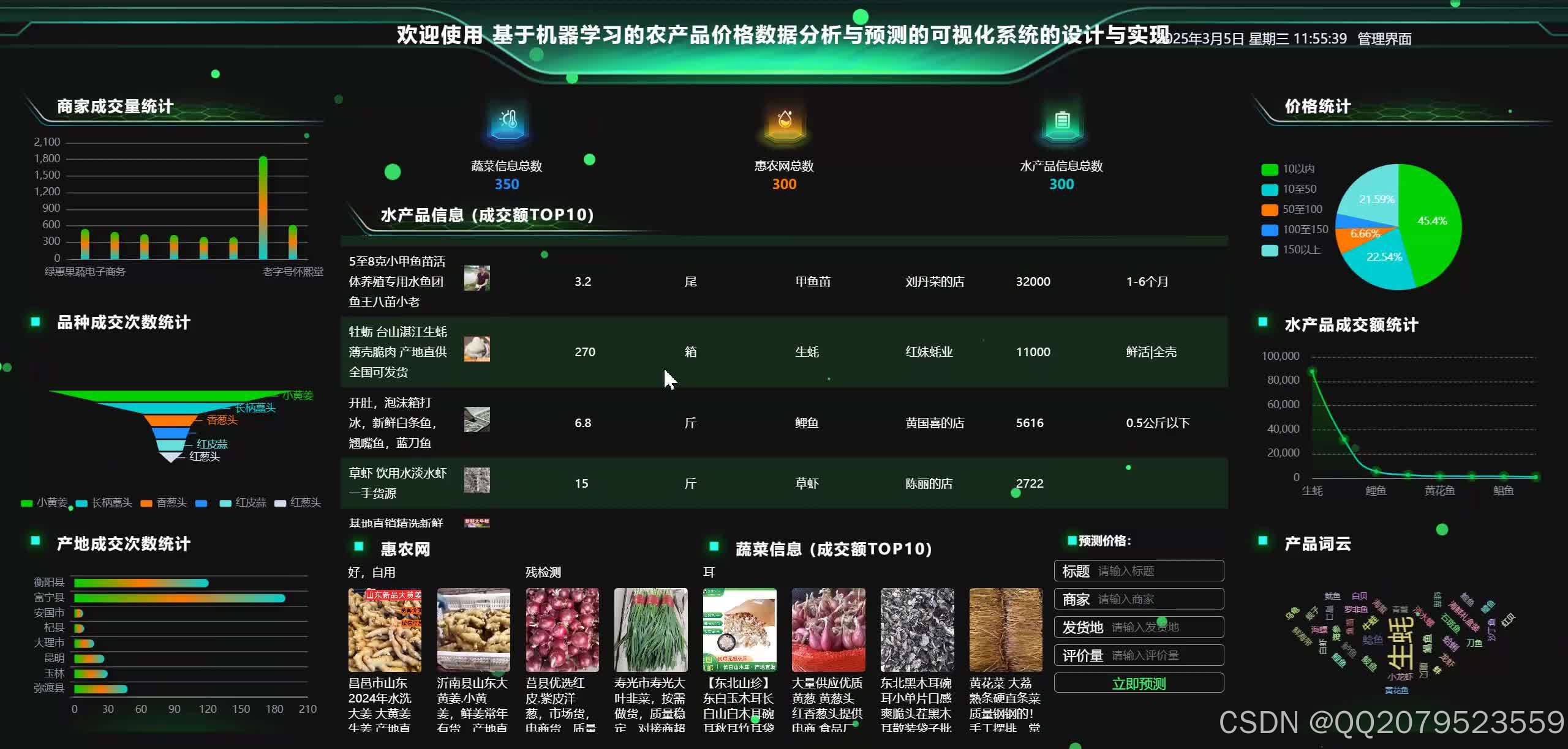 该系统结合机器学习的预测能力与可视化的直观呈现优势,可解决传统农产品价格分析中数据杂乱、预测滞后的痛点,为农户、经销商、监管部门提供决策支撑,以下从背景、技术、价值三方面阐述,控制篇幅约 350 字。
