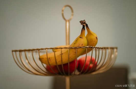 这是一个带有简单设计的水果碗图片。碗由金属制成,带有弯曲的金属丝边缘,形成了一个开放结构,使得水果从各个角度都可见。碗内有两根黄色的香蕉,放在一个似乎是红苹果的上面。香蕉略微过熟,果皮上的棕色斑点表明了这一点。碗的顶部有一个金属环,可能用作提手。碗放置在一个平坦的表面上,背景为中性色,清晰地展示了碗内的水果。