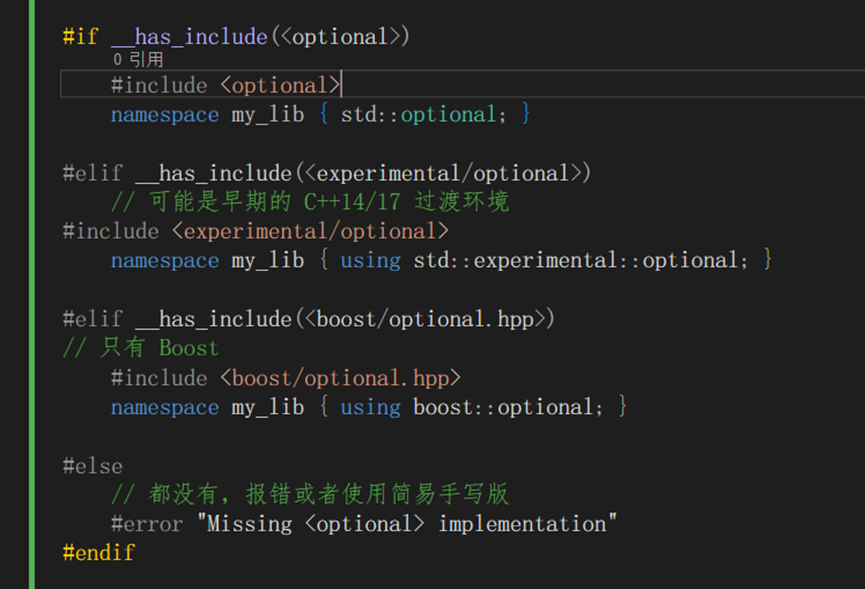 示例1:比如std::optional是C++17的,但如果用户环境只有C++14,可以降级使用boost::optional。