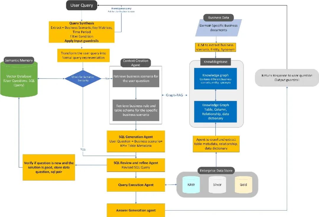 知识图谱在这一架构中扮演着"语义中枢"的角色。它不仅用于存储与业务场景相关的术语、同义词和业务规则,还负责建模特定领域内的核心概念及其相互关系。例如,在零售行业,"销售额"可能对应"订单表中的 quantity × price 字段",而在金融领域则可能涉及更复杂的计算逻辑。通过将这些语义信息结构化地组织在知识图谱中,系统能够更准确地理解用户的自然语言意图,并将其转化为精确的 SQL 查询。