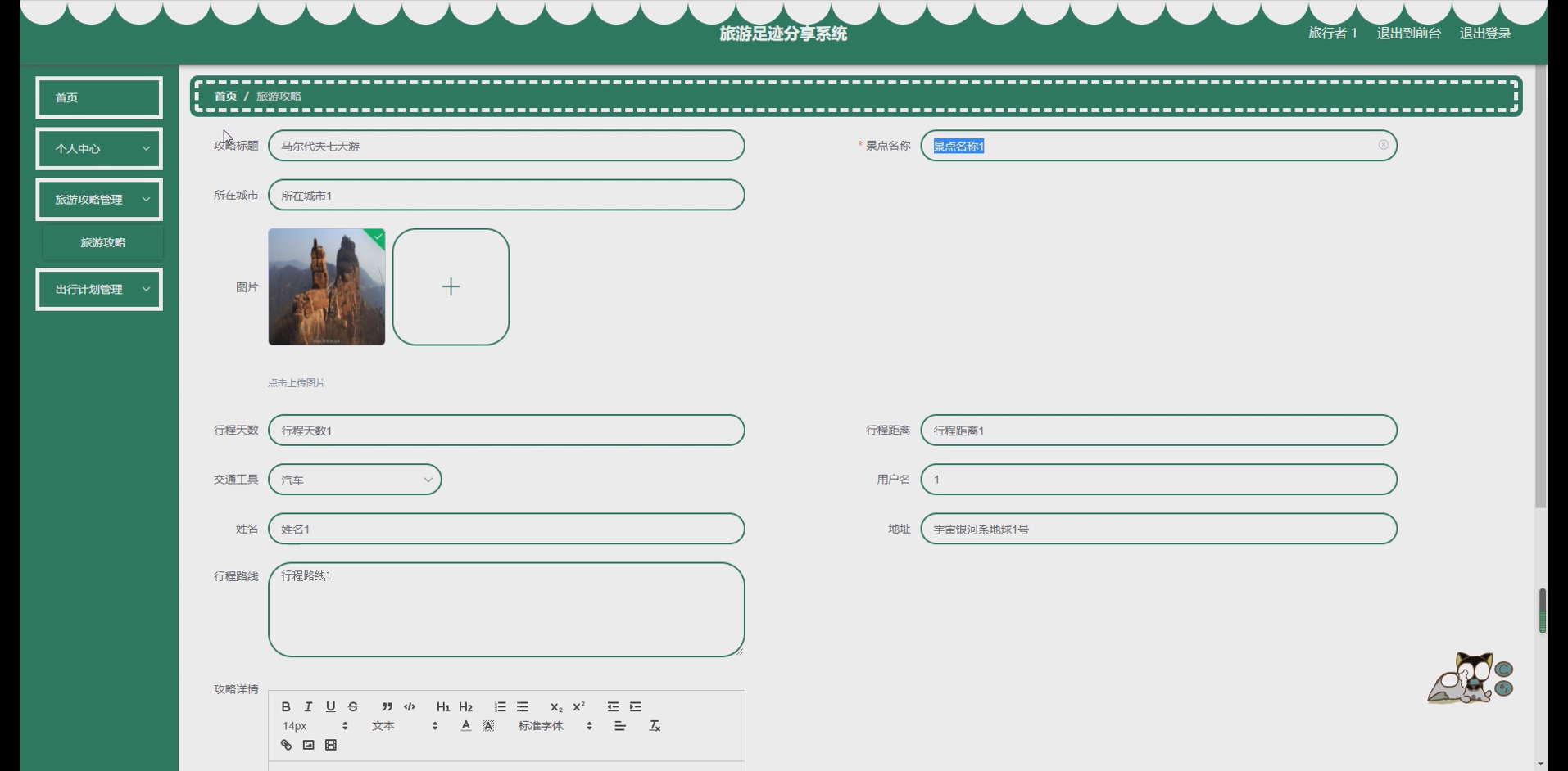打造便捷的旅游攻略分享平台,支持用户发布、编辑、查询攻略,实现攻略内容的分类展示和精准检索。