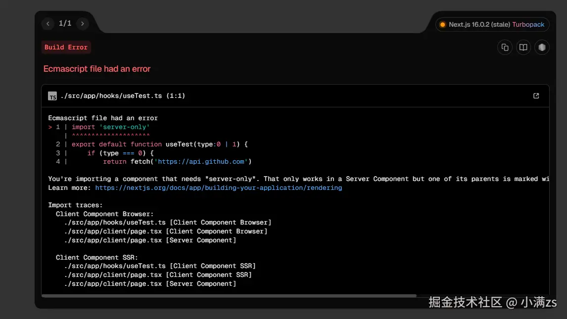 安装完成这个包之后,只需要在文件的顶部编写 import 'server-only' 声明即可,这样他就会在服务端执行,在客户端执行会报错。