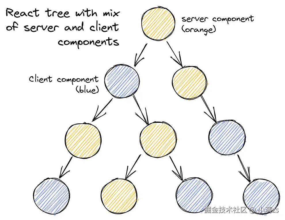 黄色节点表示服务器组件,虚线节点表示客户端组件