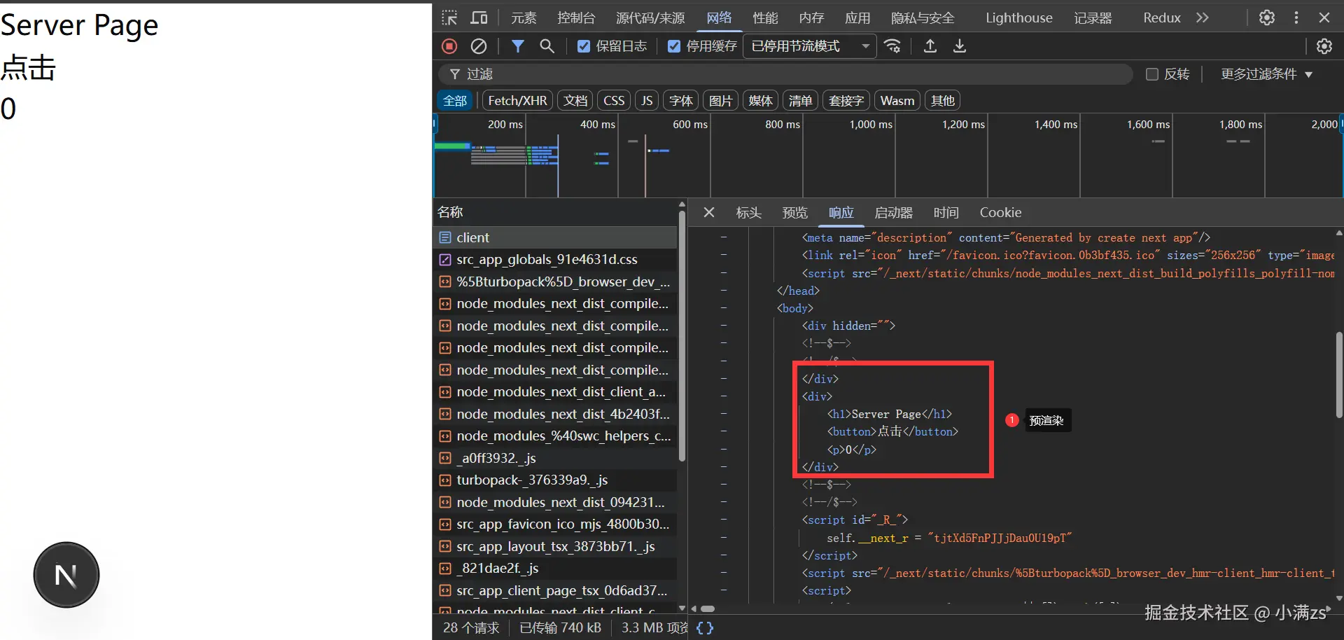 那么Next.js发现客户端组件也会在服务器生成这个结构,那干脆直接服务器里面把客户端组件进行预渲染(不包含交互),这样我们就能快速看到数据,等他加载完成后再进行水合,所以客户端组件也会在服务器进行一次预渲染。