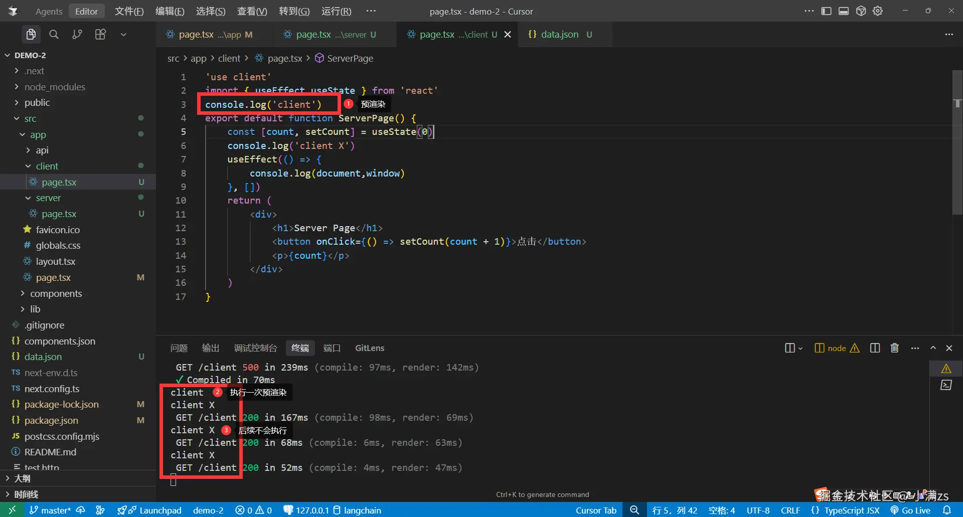 声明客户端组件需要在文件的顶部编写 'use client' 声明这是客户端组件,但是注意客户端组件会在服务端进行一次预渲染,所以访问document window 等API需要在useEffect中访问。