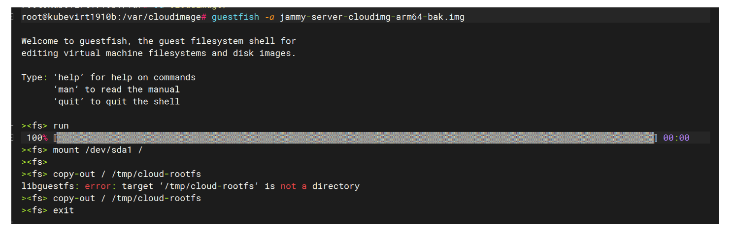 copy-out / /tmp/cloud-rootfs #从镜像内复制文件到本地系统