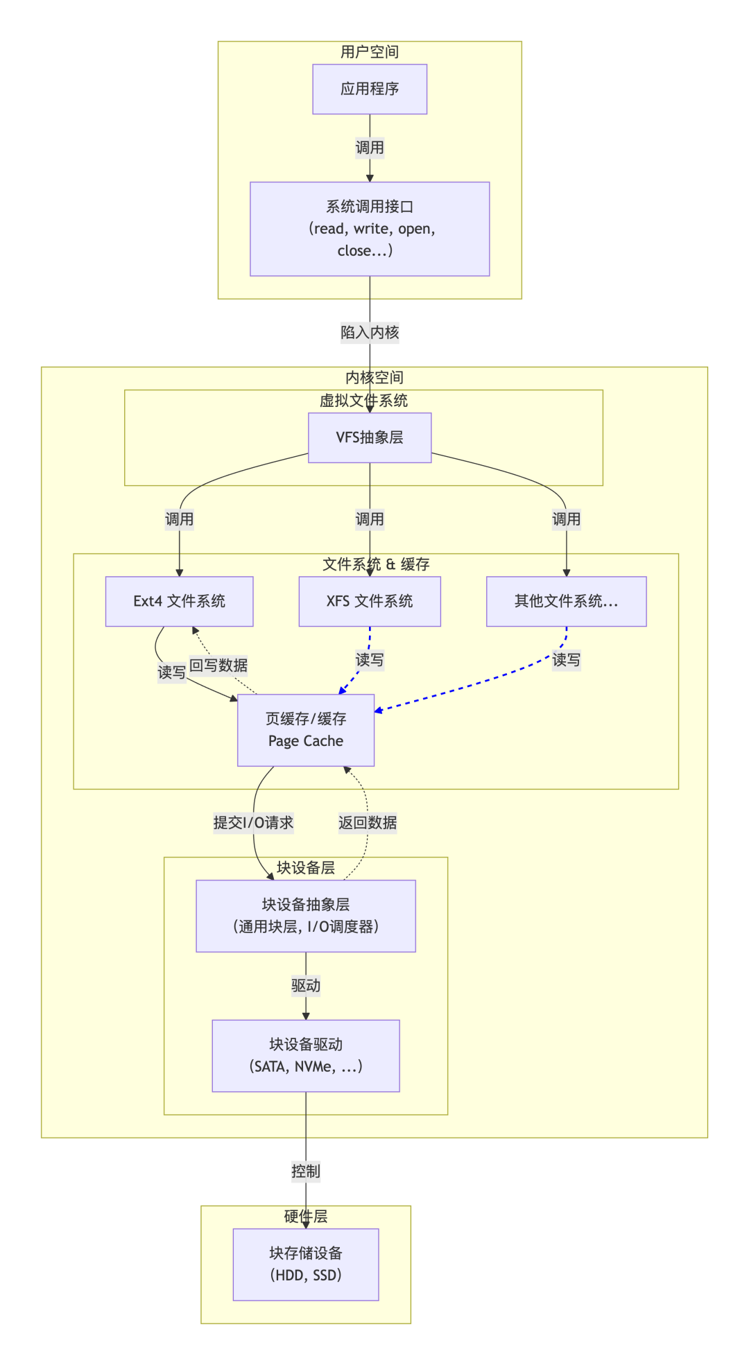 根据这个图,我们很清晰的就可以了解到从 ** 应用层 ** → ** 系统接口 ** → ** 虚拟文件系统 ** → ** 各种文件系统