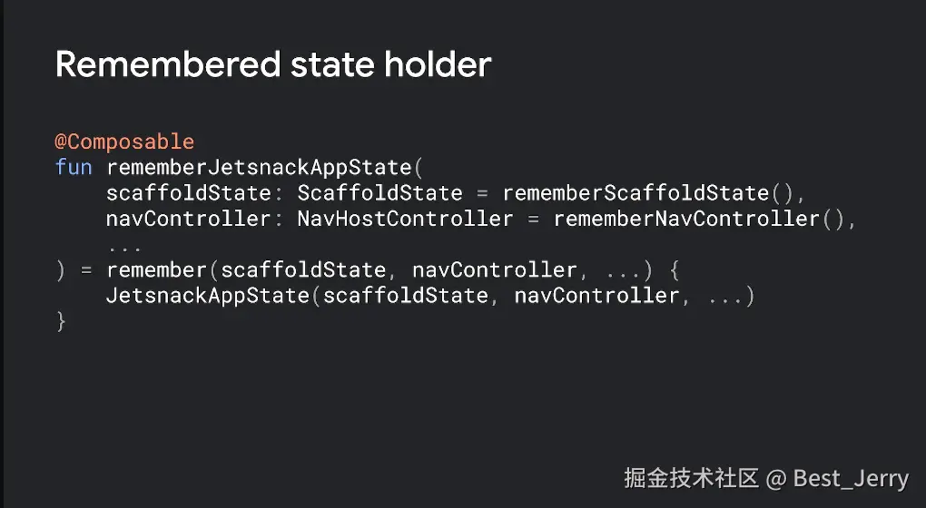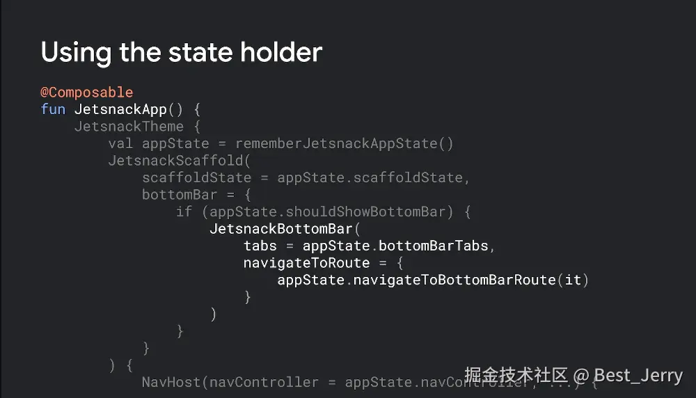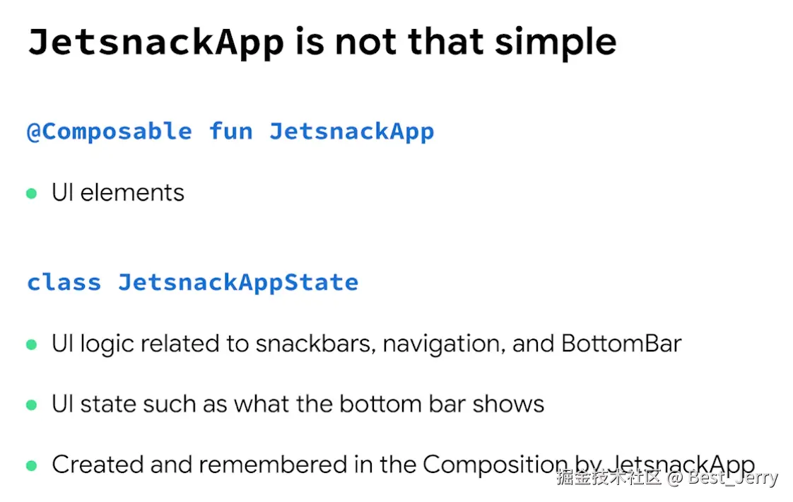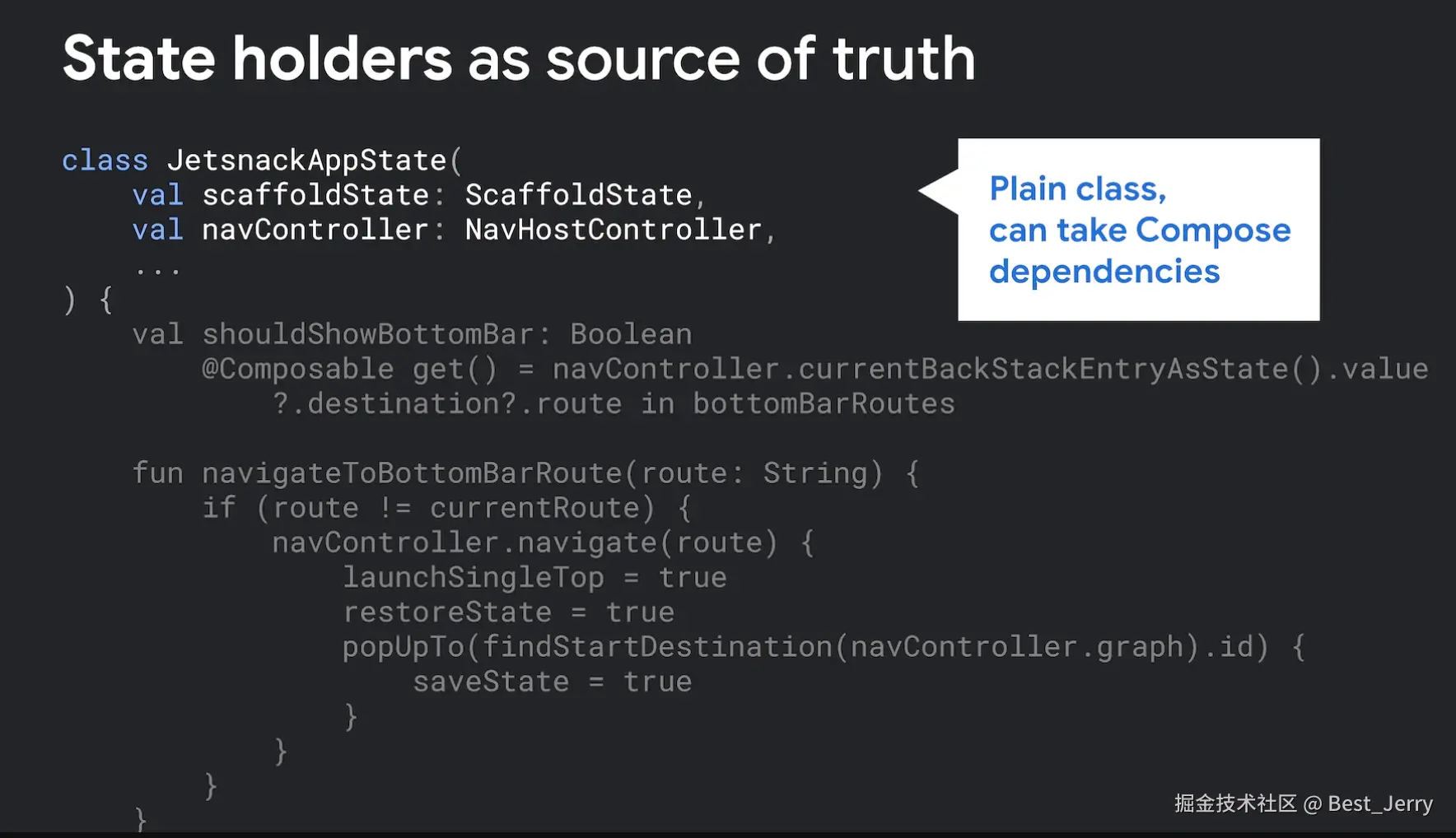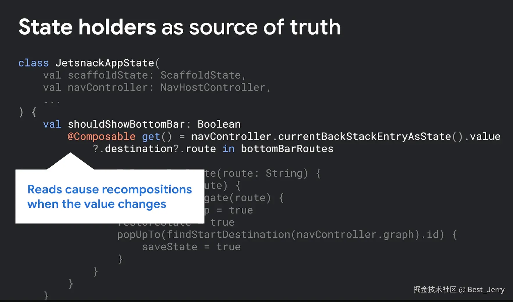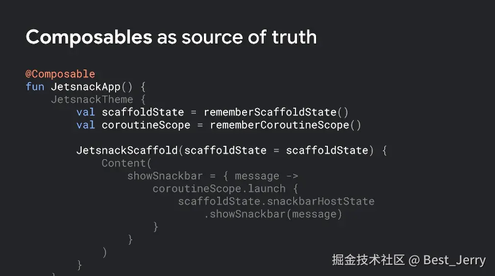 在本例中,JetsnackApp()可组合项持有 scaffoldState,由于 scaffoldState 包含可变属性,因此,与它相关的所有交互都应该在这个可组合项中进行。否则,如果将它传递给其他可组合项,这些可组合项可能会改变它的状态,这不符合单一可信来源原则,而且会使 bug 跟踪变得更加困难。