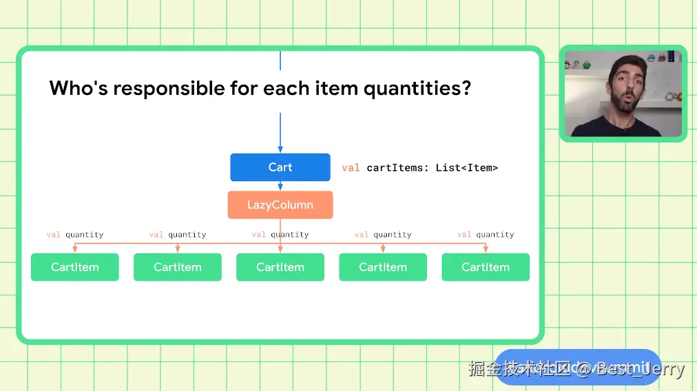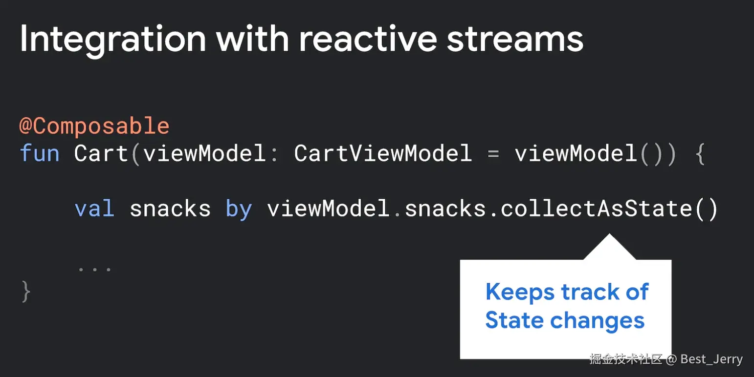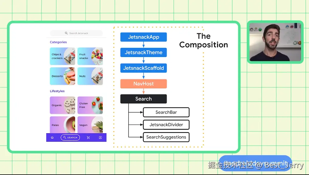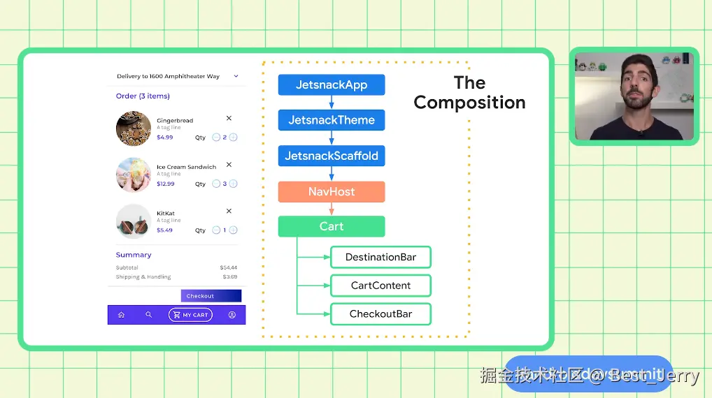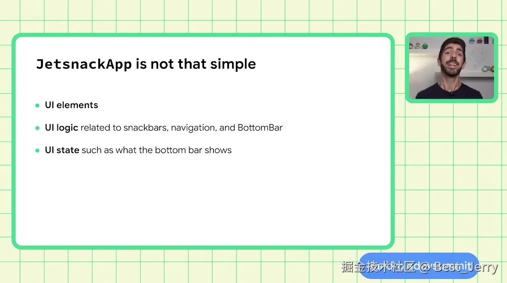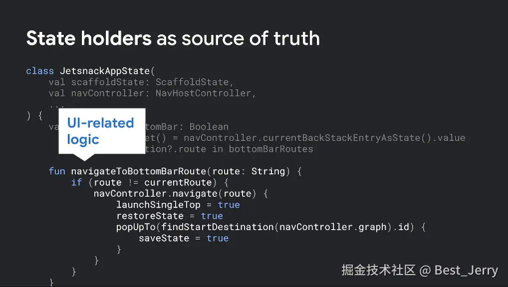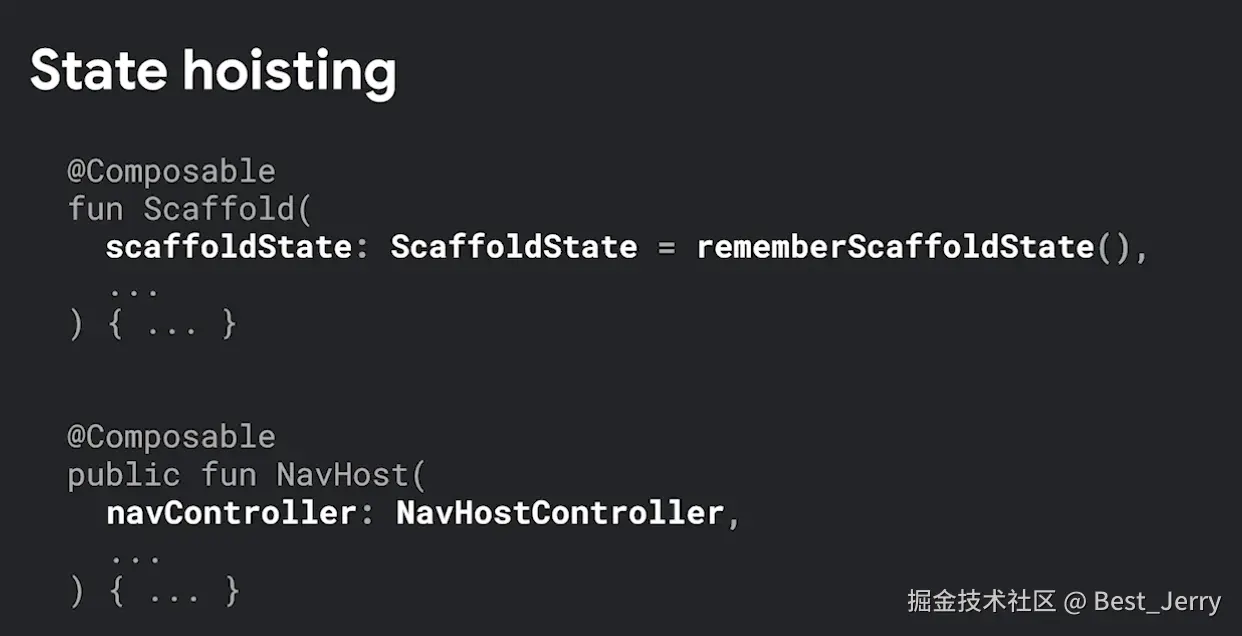 在本例中,JetsnackApp()可组合项持有 scaffoldState,由于 scaffoldState 包含可变属性,因此,与它相关的所有交互都应该在这个可组合项中进行。否则,如果将它传递给其他可组合项,这些可组合项可能会改变它的状态,这不符合单一可信来源原则,而且会使 bug 跟踪变得更加困难。