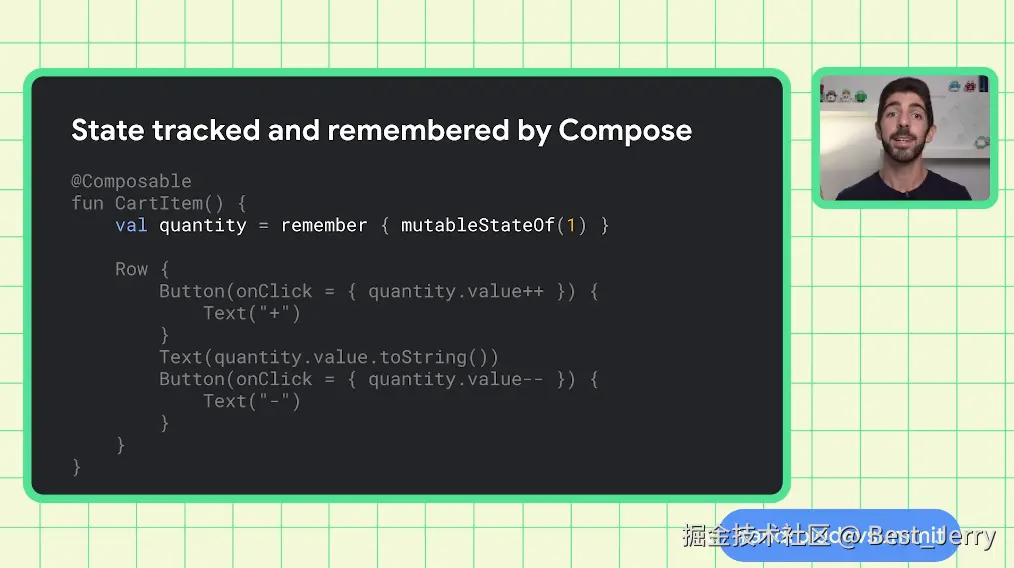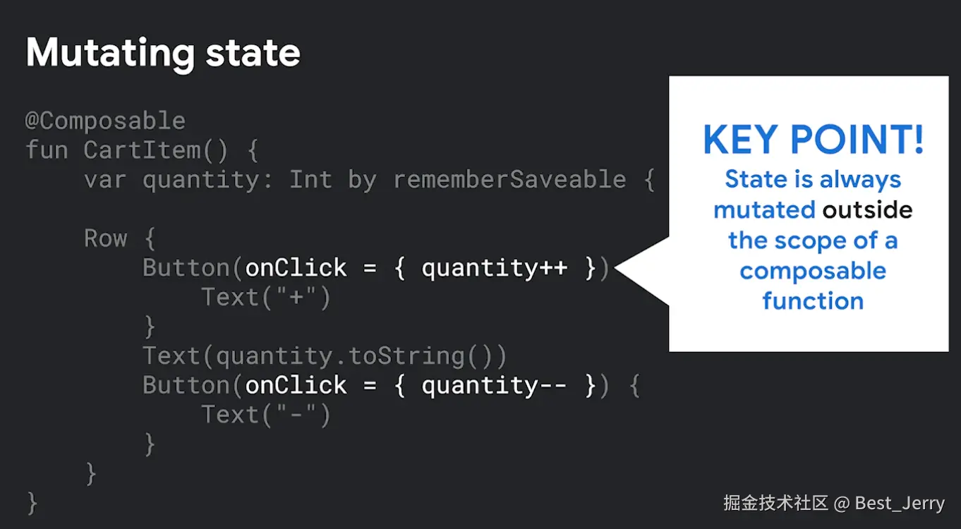 你应该只在可组合函数的作用域之外改变状态,因为可组合项可以频繁运行并以任何顺序执行。