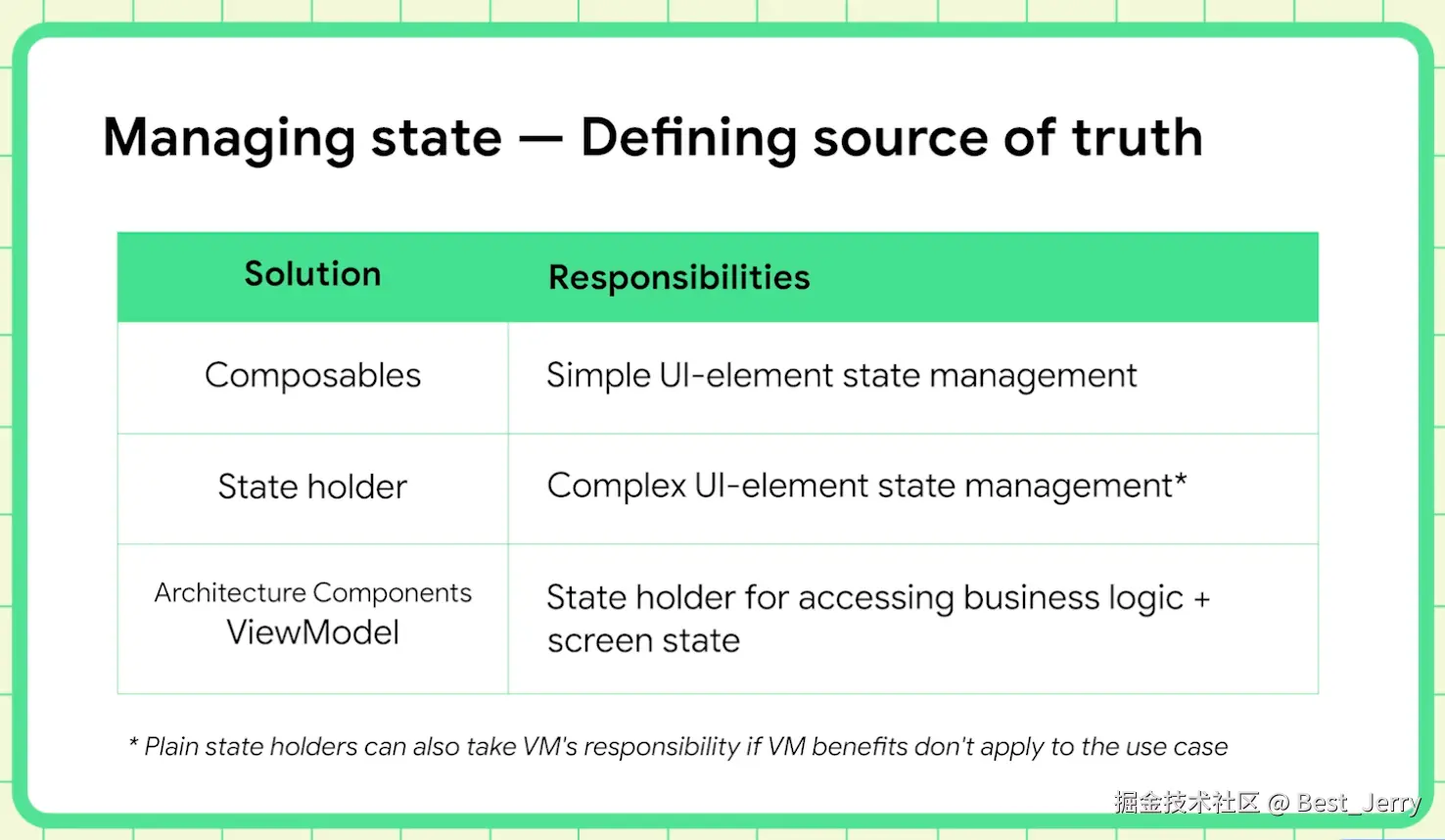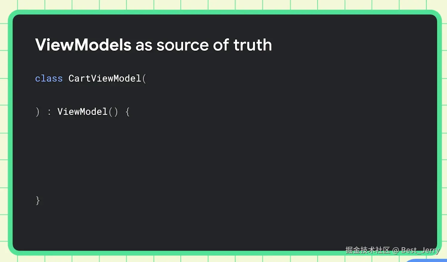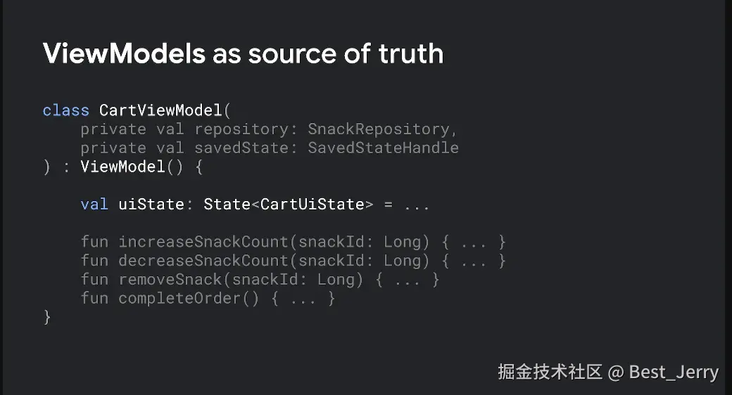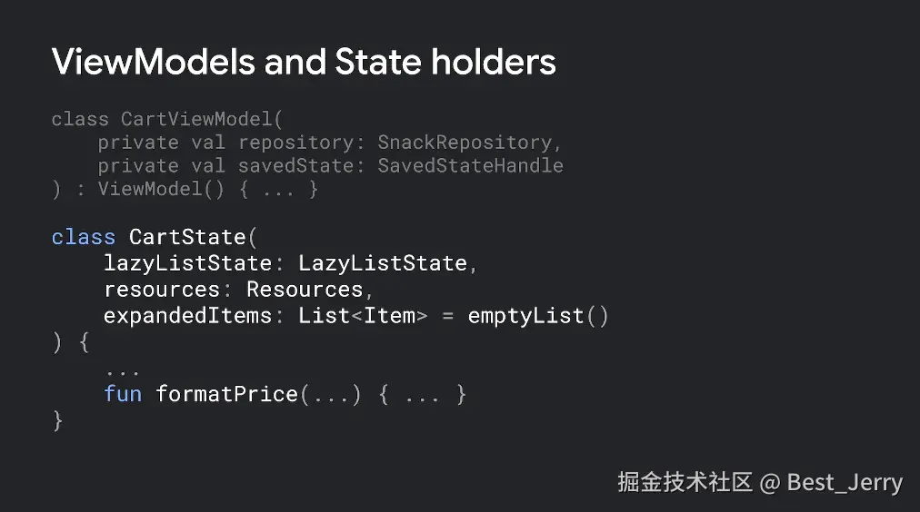 总的来说,ViewModel 可以将状态提升到组合之外并具有更长的生命周期。ViewModel 负责屏幕的业务逻辑决定要显示哪些数据,从其他层获取数据并对这些数据进行呈现前的准备用于演示。