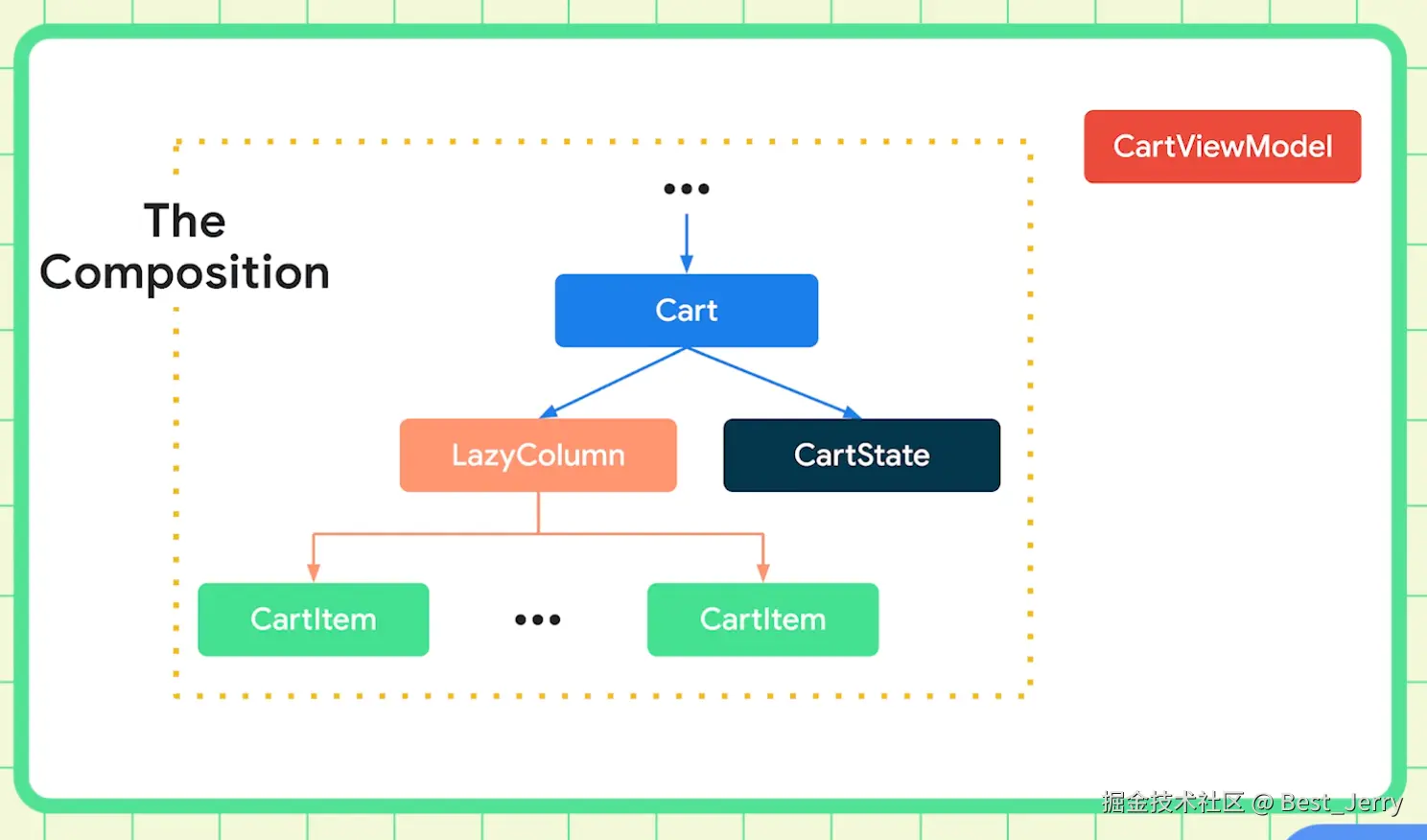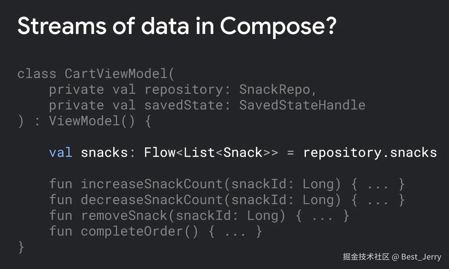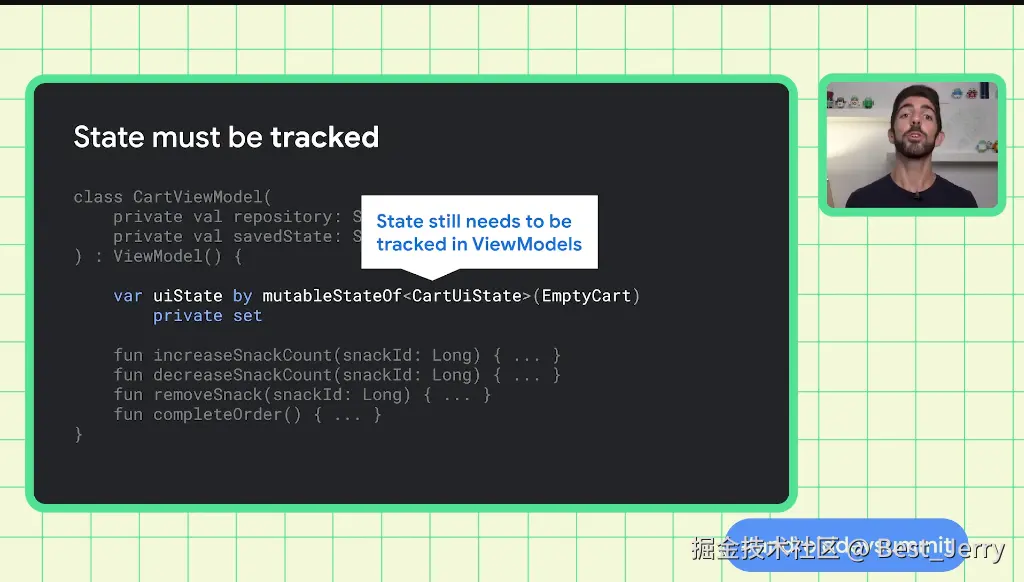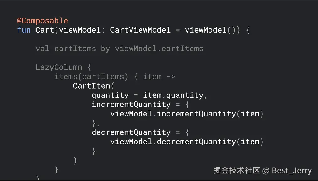 总的来说,ViewModel 可以将状态提升到组合之外并具有更长的生命周期。ViewModel 负责屏幕的业务逻辑决定要显示哪些数据,从其他层获取数据并对这些数据进行呈现前的准备用于演示。
