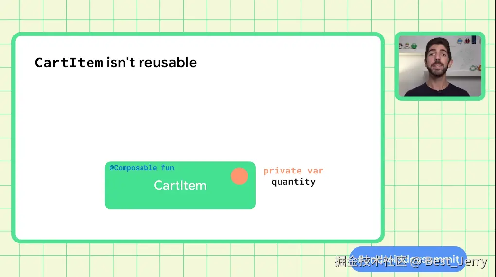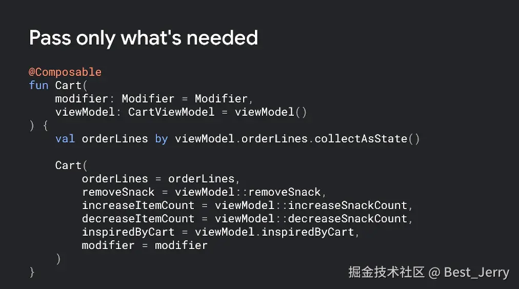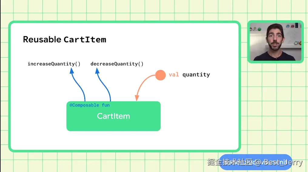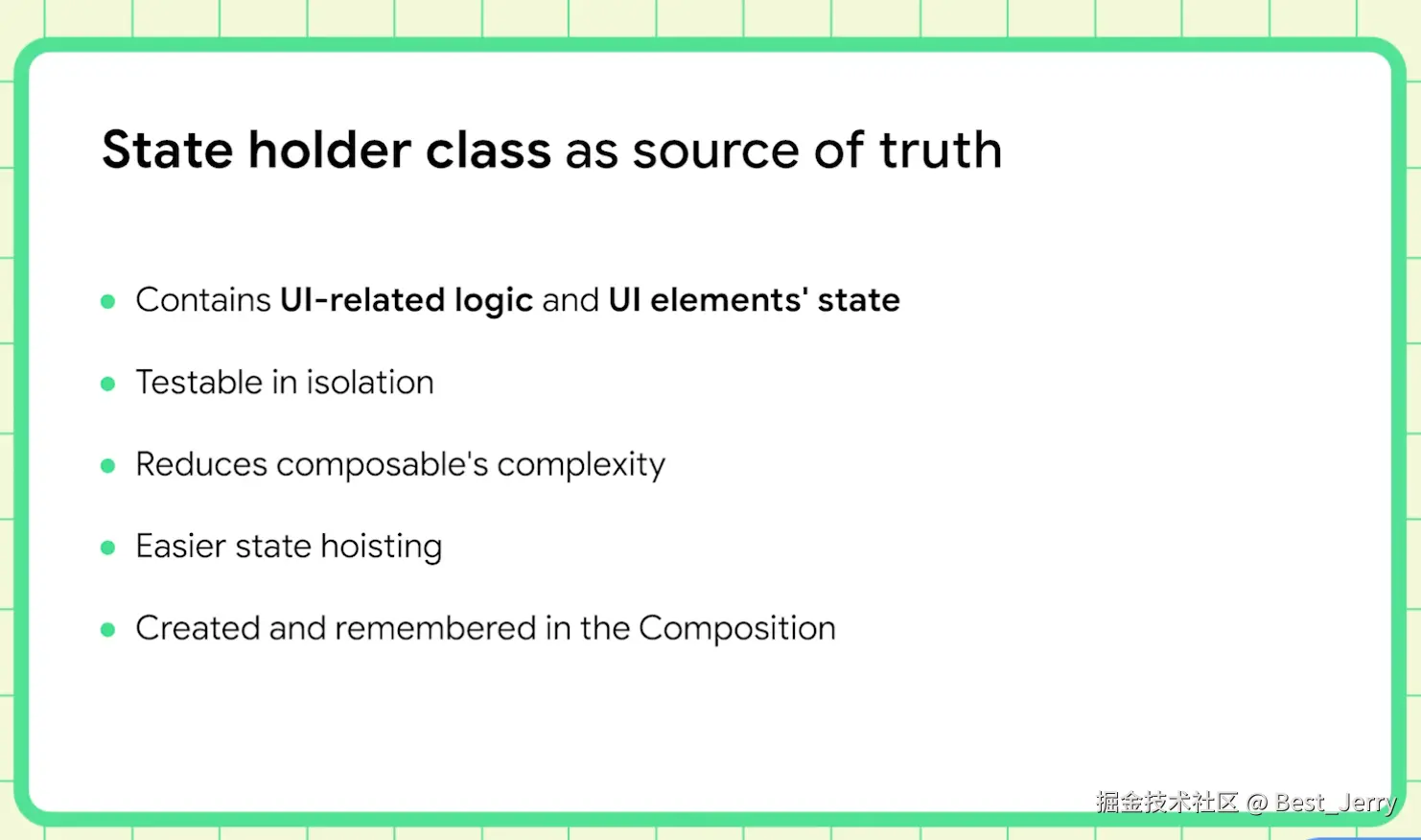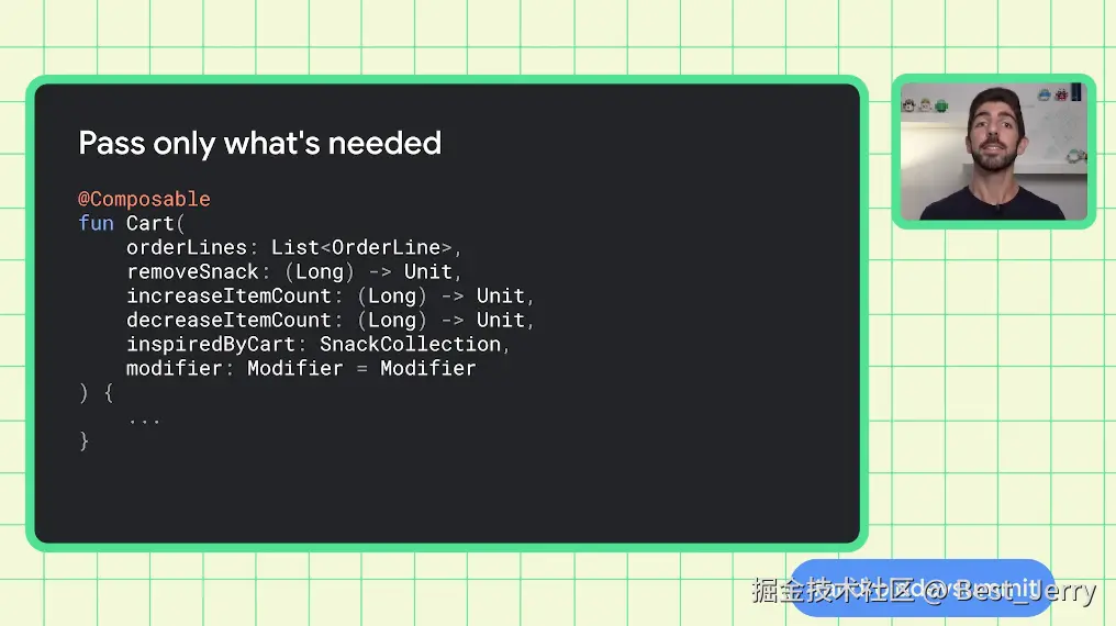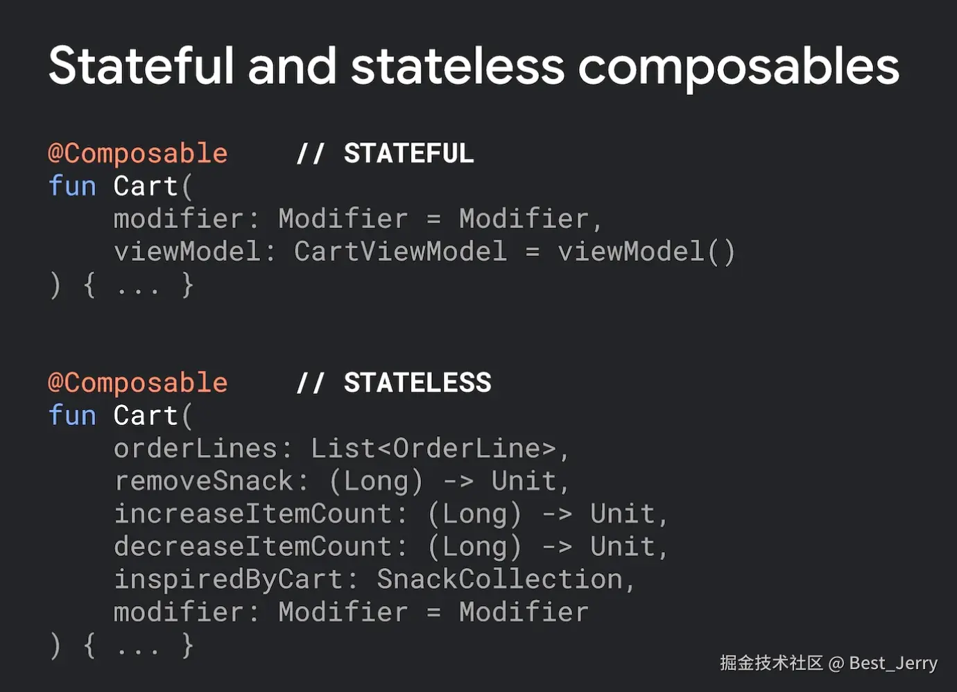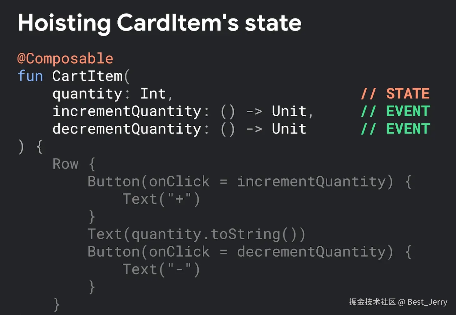 可组合项应接收状态作为参数并使用 lambda 向上传递事件,这样可以提高可组合项的可重用性和可测试性。