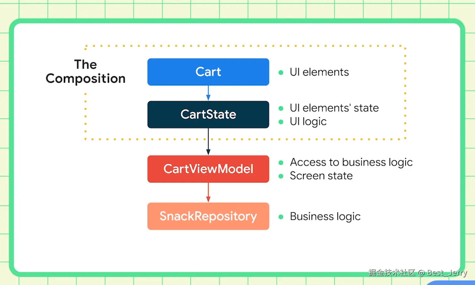 屏幕或界面状态是指需要在屏幕上显示的内容,要显示在屏幕上,例如,CartUiState 可以包含 CartItem,向用户显示的消息或加载标志,此类状态通常与层次结构中的其他层相关联,因为它包含应用数据。