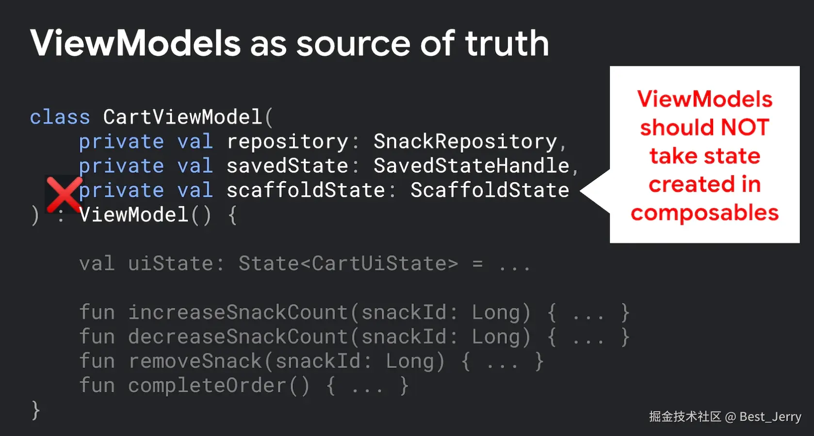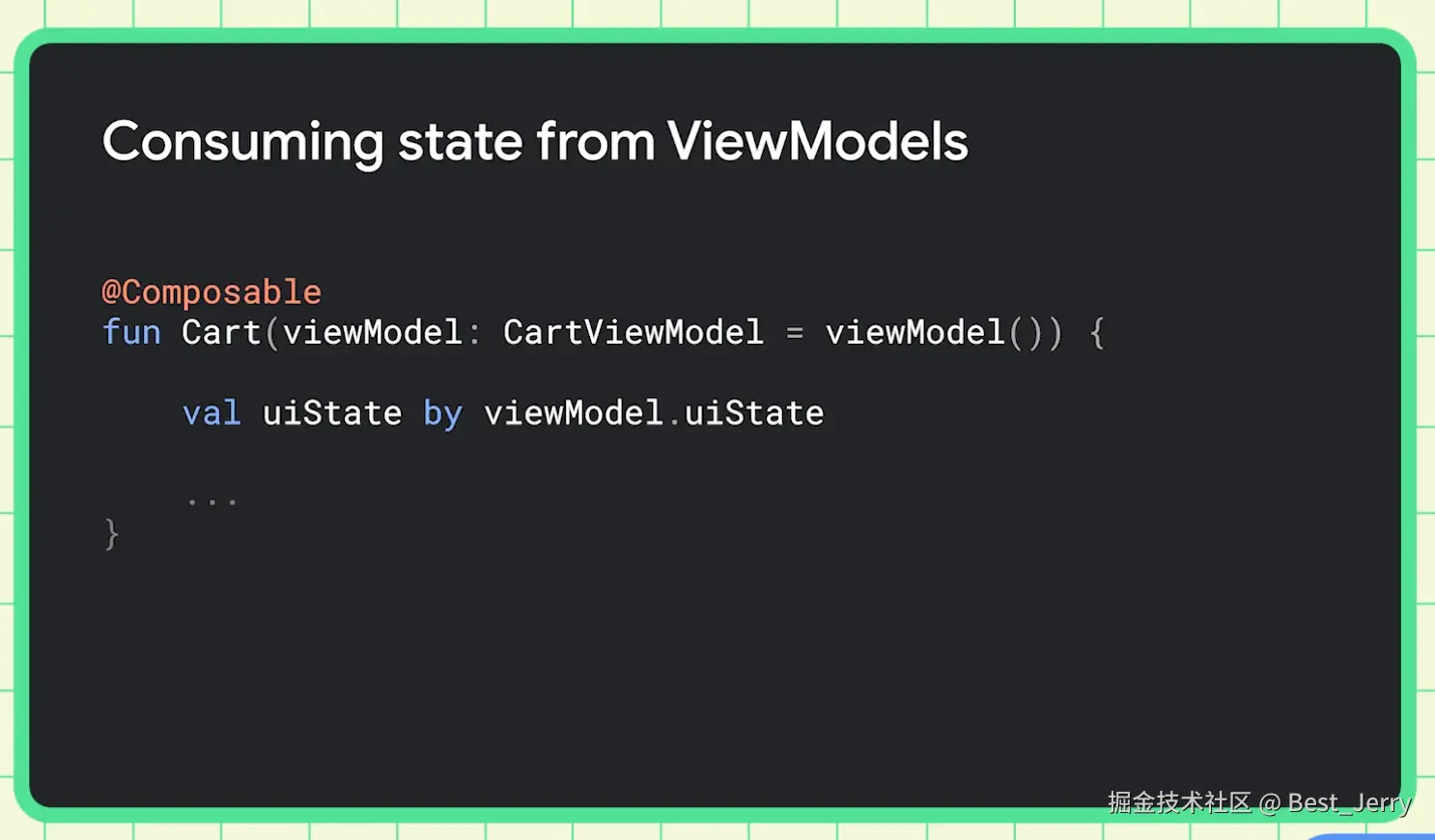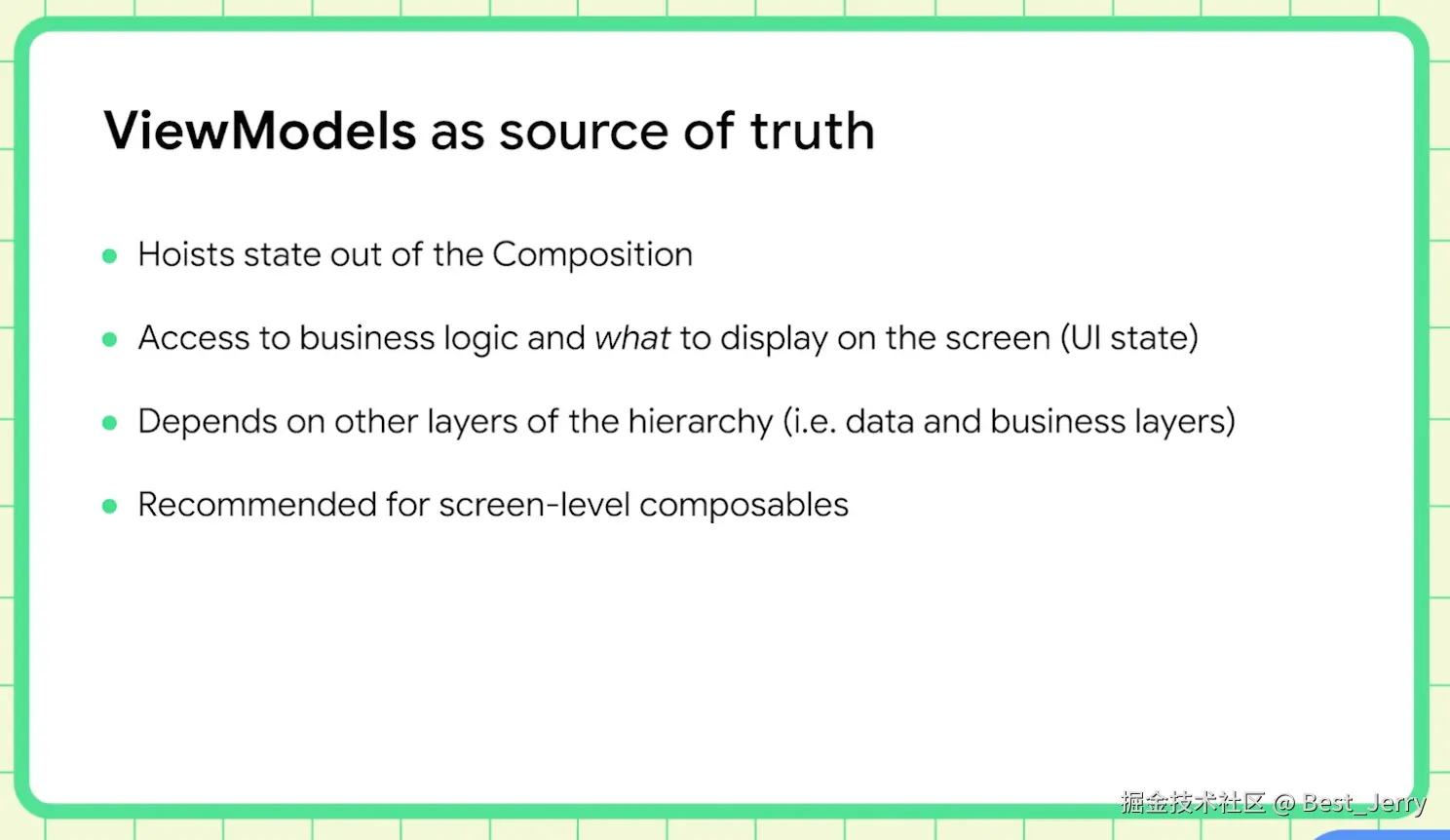 因此,建议在屏幕级可组合项中使用 ViewModel。