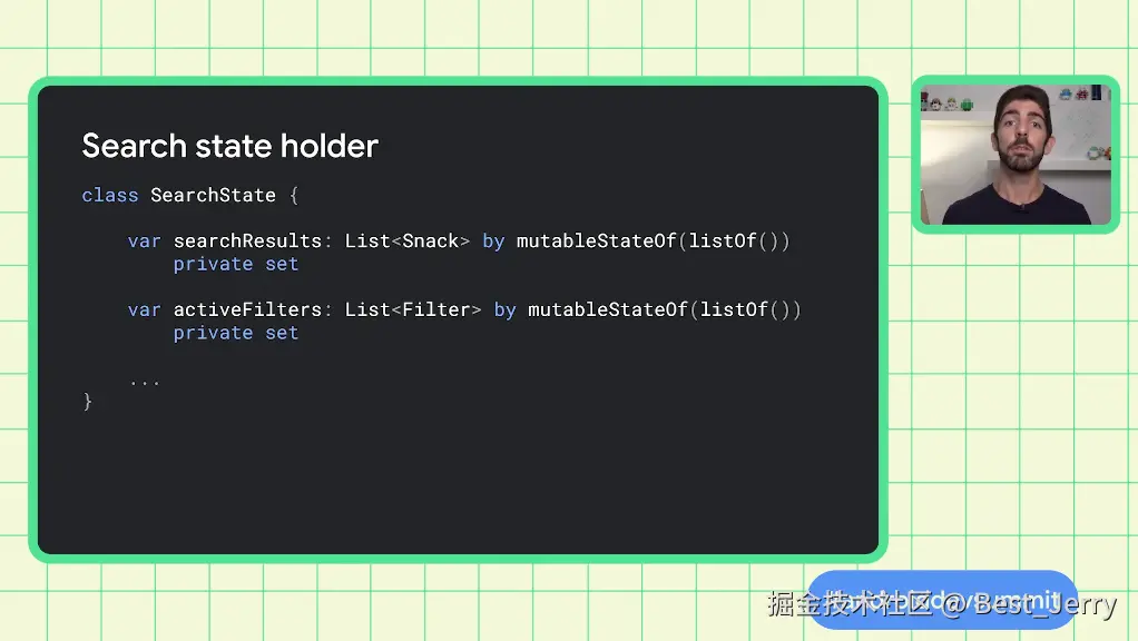 根据分离关注点原则,我们可以将界面逻辑和界面元素状态,委托给称为"状态容器"的另一个类,并保留可组合函数,并让可组合函数只负责发出界面元素。JetsnackAppState 将是 JetsnackApp 的界面元素状态的可信来源。因此所有状态写入都应在该类中进行。